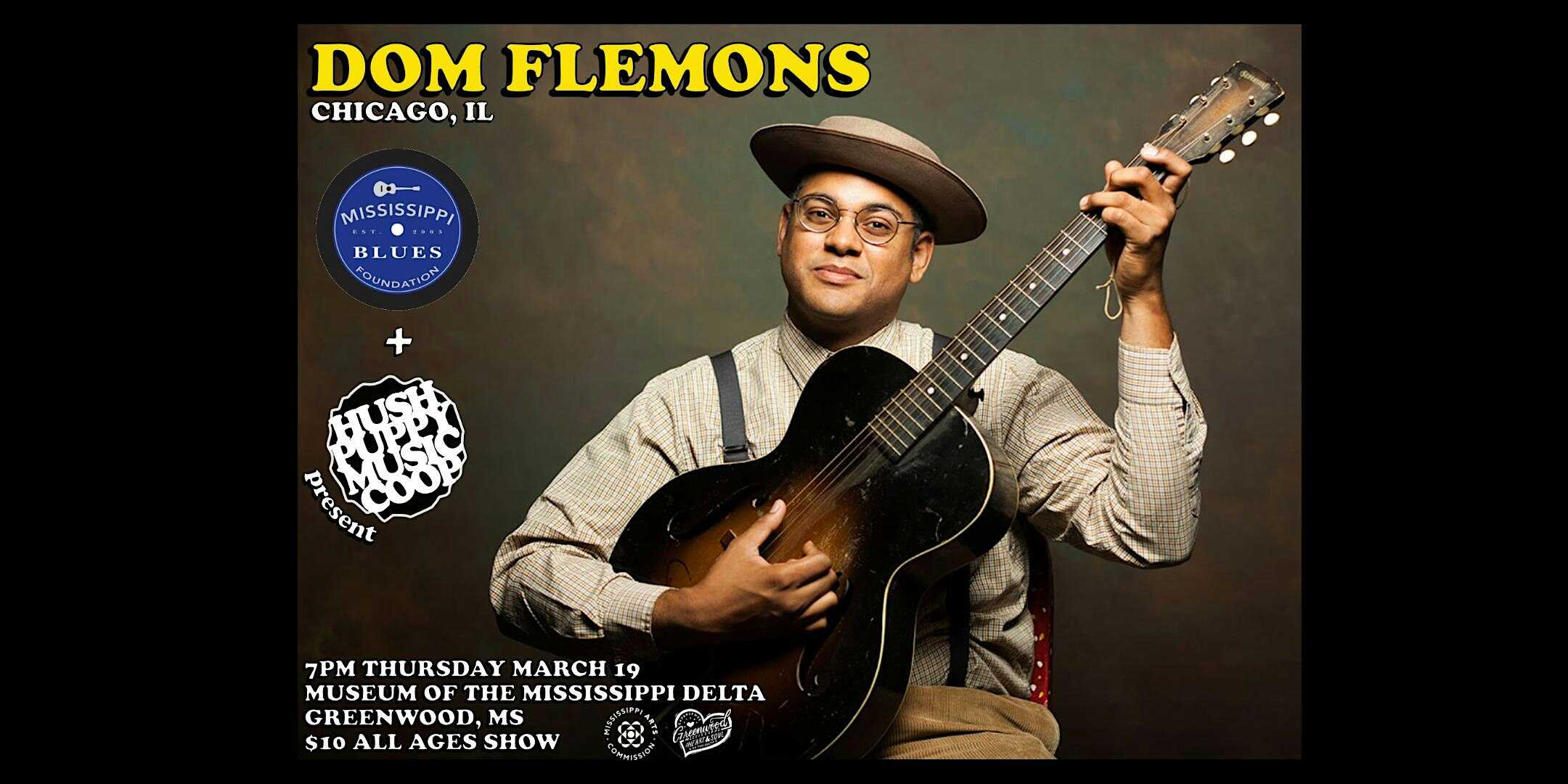 by admin23Feb DOM FLEMONS live @ Hush Puppy Music Co-op at Museum of the Mississippi Delta – Greenwood, MS DOM FLEMONS live @ Hush Puppy Music Co-op at Museum of the Mississippi Delta – Greenwood, MS 2 2 people viewed this event. Grammy Award Winner Dom Flemons performs live at the Museum of the Mississippi Delta in Greenwood, Mississippi. Tickets-RSVP Link Date And Time Thursday, March 19th, 2026 07:00 PM (PST) Venue Museum of the Mississippi Delta Location 1608 U.S. 82, Greenwood, MS 38930 Event Types Concert or PerformanceMusic Event Category Mississippi Share With Friends Facebook Twitter Linkedin Xing Pinterest Share This Post: