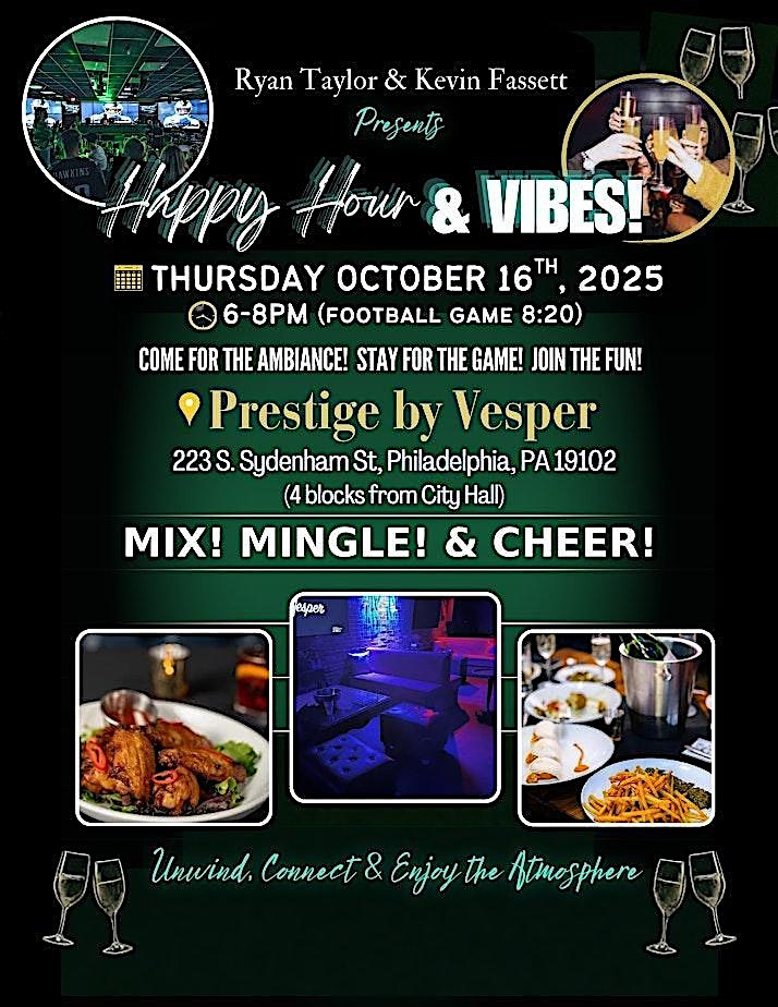 by admin13Feb Happy Hour & Vibes at Prestige by Vesper – Philadelphia, PA Happy Hour & Vibes at Prestige by Vesper – Philadelphia, PA 1 1 people viewed this event. An afterwork experience w/ Happy Hour, Thursday Night Football & a mix of good people & vibes! Tickets-RSVP Link Date And Time Thursday, March 19th, 2026 10:00 PM (PST) Venue Prestige by Vesper Location 223 South Sydenham Street, Philadelphia, PA 19102 Event Types Food & DrinkParty or Social Gathering Event Category PennsylvaniaPhiladelphia Share With Friends Facebook Twitter Linkedin Xing Pinterest Share This Post: