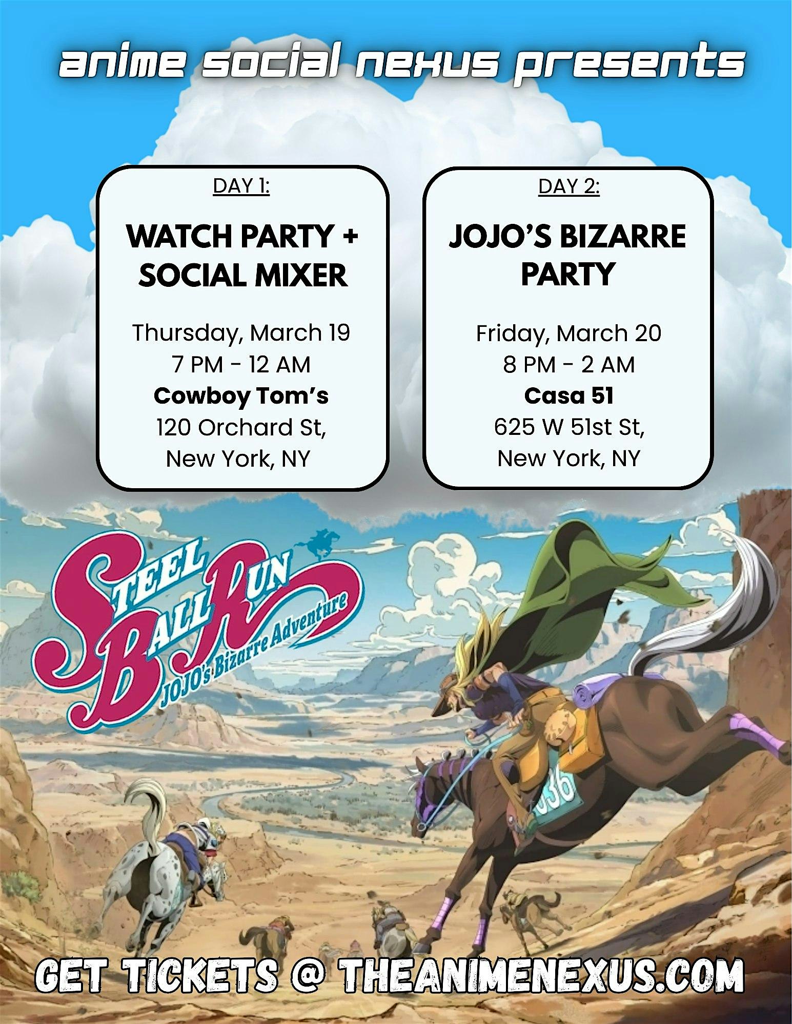 by admin13Feb JoJo Steel Ball Run Watch Party & Social Mixer at Cowboy Tom’s – New York, NY JoJo Steel Ball Run Watch Party & Social Mixer at Cowboy Tom’s – New York, NY 1 1 people viewed this event. Celebrate the release of JoJo’s Bizarre Adventure: Steel Ball Run with other fans at a premiere party social mixer in NYC! Tickets-RSVP Link Date And Time Thursday, March 19th, 2026 11:00 PM (PST) Venue Cowboy Tom's Location 120 Orchard Street, New York, NY 10002 Event Types Film, Media & EntertainmentParty or Social Gathering Event Category New YorkNew York City Share With Friends Facebook Twitter Linkedin Xing Pinterest Share This Post: