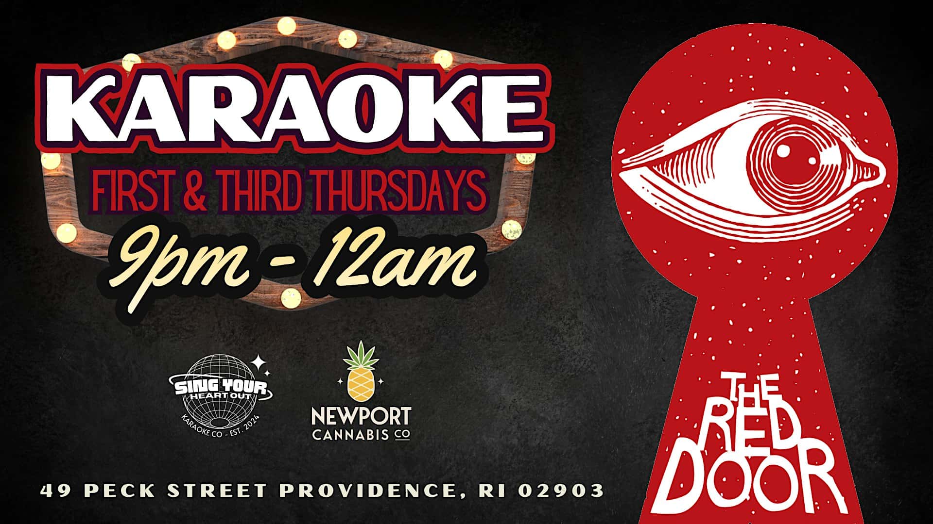 Karaoke Thursdays @ Red Door (Providence) at Red Door – Providence, RI Karaoke Thursdays @ Red Door (Providence) at Red Door – Providence, RI 2 2 people viewed this event. Presented by Sing Your Heart Out Co. & Sponsored by Newport Cannabis Tickets-RSVP Link Register for event Date And Time Thursday, March 19th, 2026 @ 07:00 PM Location 49 Peck Street, Providence, RI 2903 Event Types MusicParty or Social Gathering Event Category ProvidenceRhode Island Share With Friends Facebook Twitter Linkedin Xing Pinterest