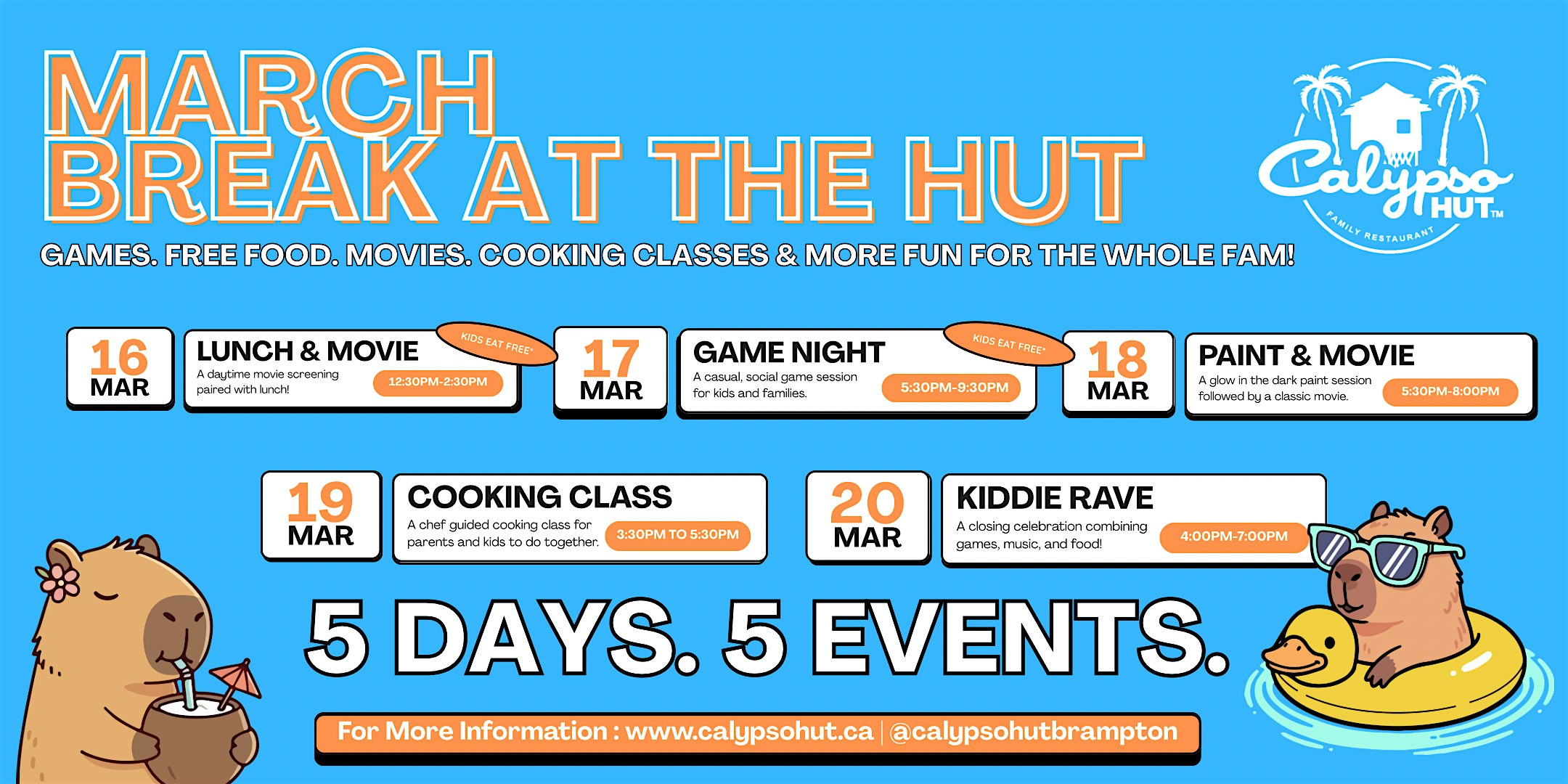 Kids Chow Mein Cooking Class Experience at Calypso Hut Family Restaurant – Brampton, Canada Kids Chow Mein Cooking Class Experience at Calypso Hut Family Restaurant – Brampton, Canada 1 1 people viewed this event. A hands-on cooking class where kids learn to make real chow mein inside our restaurant kitchen, guided by our team. Tickets-RSVP Link Register for event Date And Time Thursday, March 19th, 2026 @ 03:00 PM Location 263 Queen Street East, Brampton, Canada L6W 2B8 Event Types Class, Training, or WorkshopFood & Drink Event Category CanadaToronto Share With Friends Facebook Twitter Linkedin Xing Pinterest
