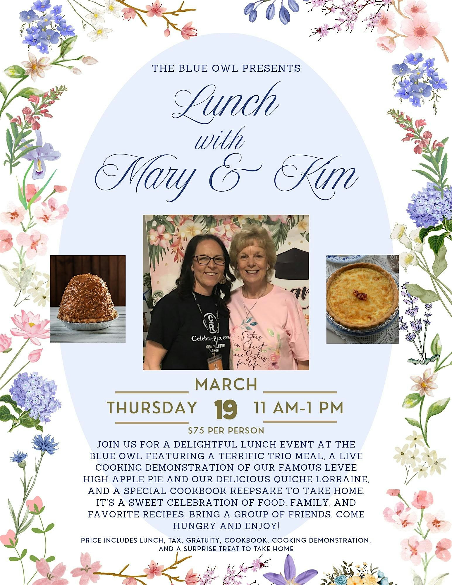 Lunch with Kim and Mary- An Exclusive Blue Owl Experience at The Blue Owl Restaurant & Bakery – Kimmswick, MO Lunch with Kim and Mary- An Exclusive Blue Owl Experience at The Blue Owl Restaurant & Bakery – Kimmswick, MO 1 1 people viewed this event. Lunch with Kim & Mary – An Exclusive Blue Owl Experience Ticket includes lunch, tip, tax, cookbook, cooking demonstrations, and dessert Tickets-RSVP Link Register for event Date And Time Thursday, March 19th, 2026 @ 11:00 AM Location 6116 2nd Street, Kimmswick, MO 63053 Event Types Dinner or GalaFood & Drink Event Category Missouri Share With Friends Facebook Twitter Linkedin Xing Pinterest