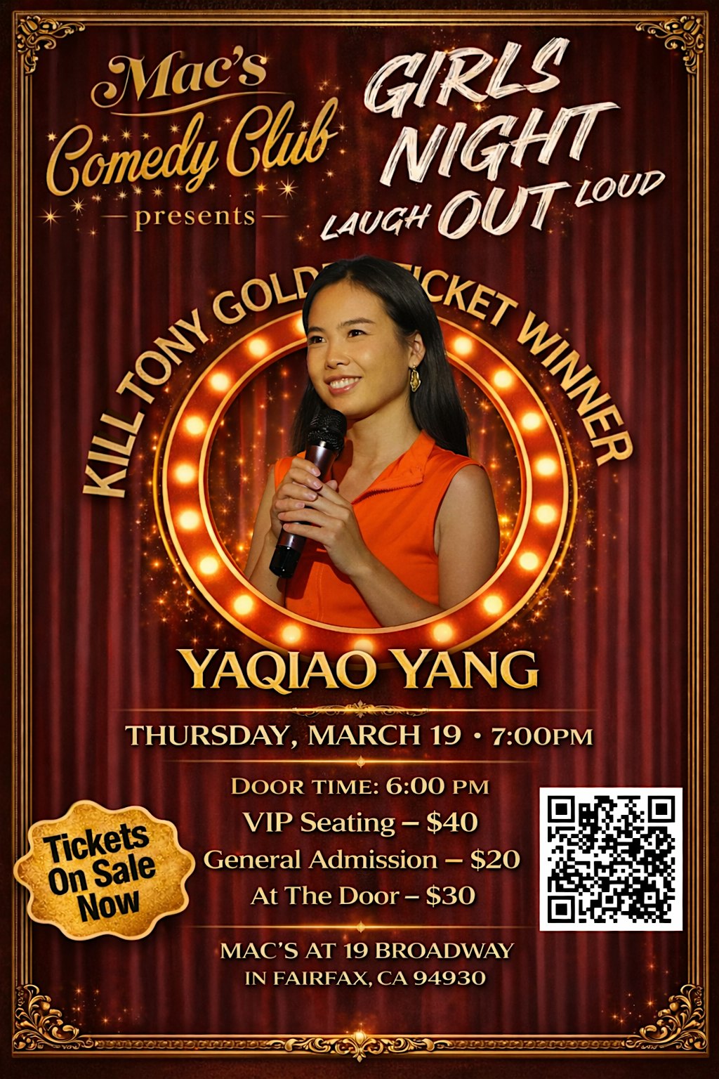 Mac’s Comedy Club Presents YAQIAO YANG at Girls Night Out at Mac’s at 19 Broadway, Broadway, Fairfax, CA, USA – Fairfax, CA