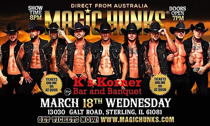 by admin14Feb MAGIC HUNKS AUSTRALIA TAKEOVER STERLING, IL USA!!! at K’s Korner and Banquet – Sterling, IL MAGIC HUNKS AUSTRALIA TAKEOVER STERLING, IL USA!!! at K’s Korner and Banquet – Sterling, IL 1 1 people viewed this event. AUSTRALIA’S ULTIAMTE GIRLS NIGHT EVENT IS COMING TO STERLING! ROUND UP YOUR PARTY SQUAD FOR THE BEST NIGHT EVER! TICKETS ON SALES NOW! 21+ Tickets-RSVP Link Date And Time Thursday, March 19th, 2026 01:00 AM (PST) Venue K's Korner and Banquet Location 13030 Galt Road, Sterling, IL 61081 Event Types Concert or PerformancePerforming & Visual Arts Event Category Illinois Share With Friends Facebook Twitter Linkedin Xing Pinterest Share This Post: