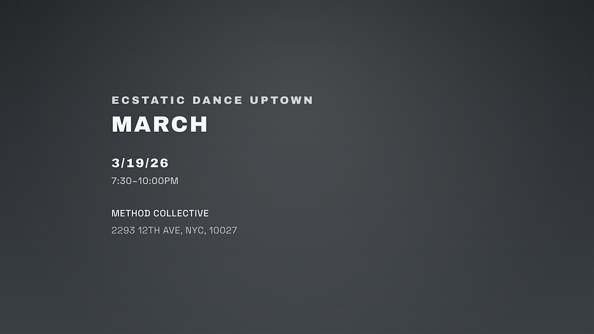 by admin23Feb March Ecstatic Dance Uptown at Method Collective – New York, NY March Ecstatic Dance Uptown at Method Collective – New York, NY 1 1 people viewed this event. An embodied dance by our resident DJ, lee waa. Tickets-RSVP Link Date And Time Thursday, March 19th, 2026 07:00 PM (PST) Venue Method Collective Location 2293 12th Avenue, New York, NY 10027 Event Types MusicParty or Social Gathering Event Category New YorkNew York City Share With Friends Facebook Twitter Linkedin Xing Pinterest Share This Post: