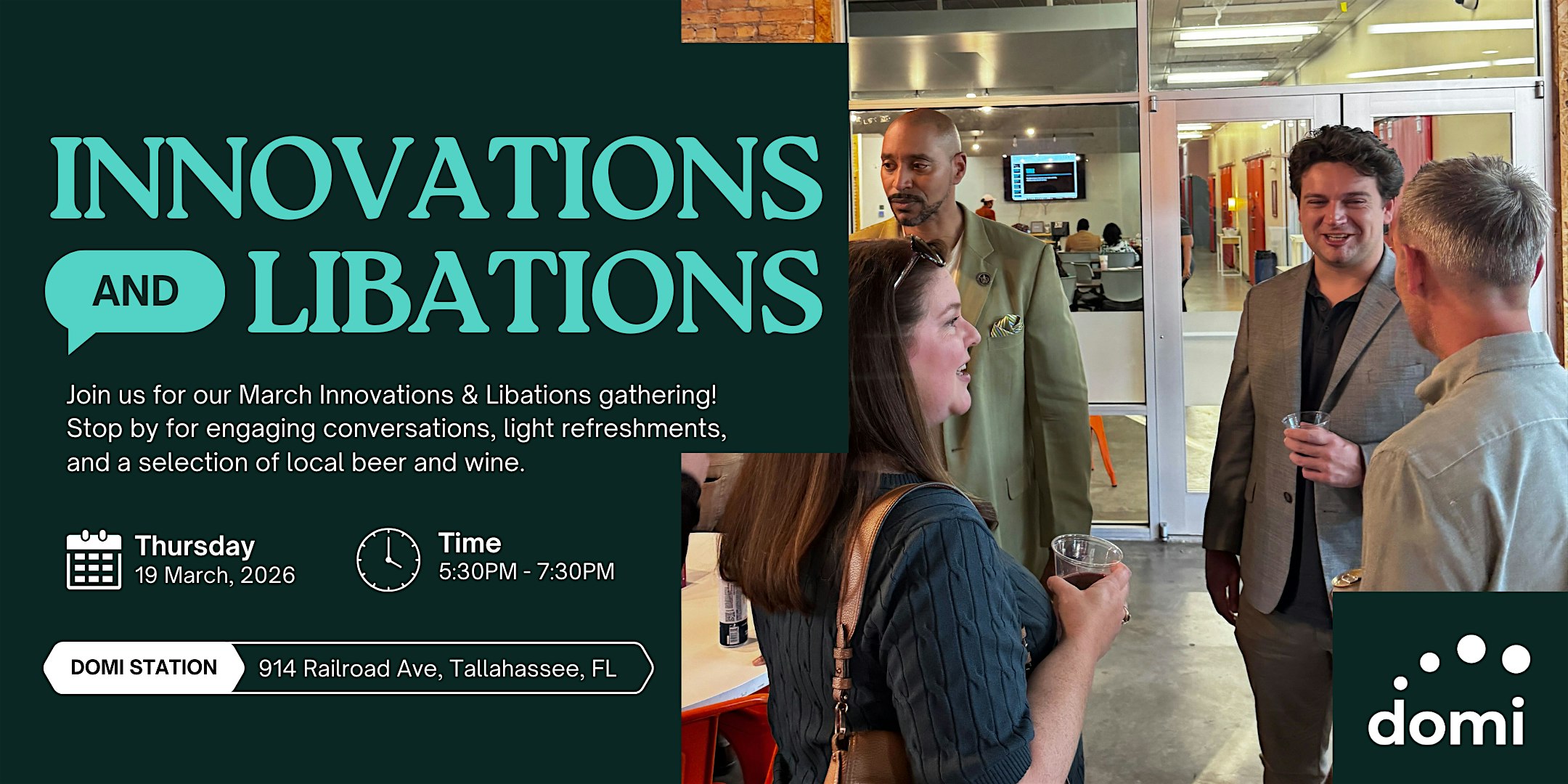 by admin27Feb March Innovations and Libations at Domi Station – Tallahassee, FL March Innovations and Libations at Domi Station – Tallahassee, FL 1 1 people viewed this event. Your Third Thursday Meetup for Ideas & Connections Tickets-RSVP Link Date And Time Thursday, March 19th, 2026 05:00 PM (PST) Venue Domi Station Location 914 Railroad Avenue, Tallahassee, FL 32310 Event Types Food & DrinkParty or Social Gathering Event Category FloridaTallahassee Share With Friends Facebook Twitter Linkedin Xing Pinterest Share This Post: