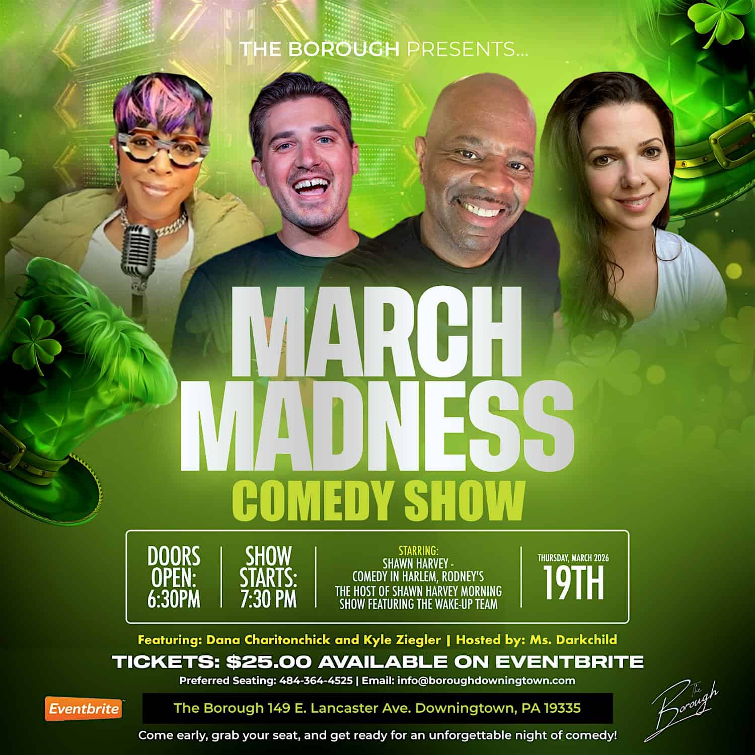 by admin14Feb March Madness Comedy Show @ The Borough – Downingtown at The Borough – Downingtown, PA March Madness Comedy Show @ The Borough – Downingtown at The Borough – Downingtown, PA 1 1 people viewed this event. Downingtown! The Borough Presents: March Madness Comedy Show.. Starring Shawn Harvey, Dana Charitonchick & Kyle Ziegler. Join us! Tickets-RSVP Link Date And Time Thursday, March 19th, 2026 10:00 PM (PST) Venue The Borough Location 149 East Lancaster Avenue, Downingtown, PA 19335 Event Types Concert or PerformancePerforming & Visual Arts Event Category Pennsylvania Share With Friends Facebook Twitter Linkedin Xing Pinterest Share This Post: