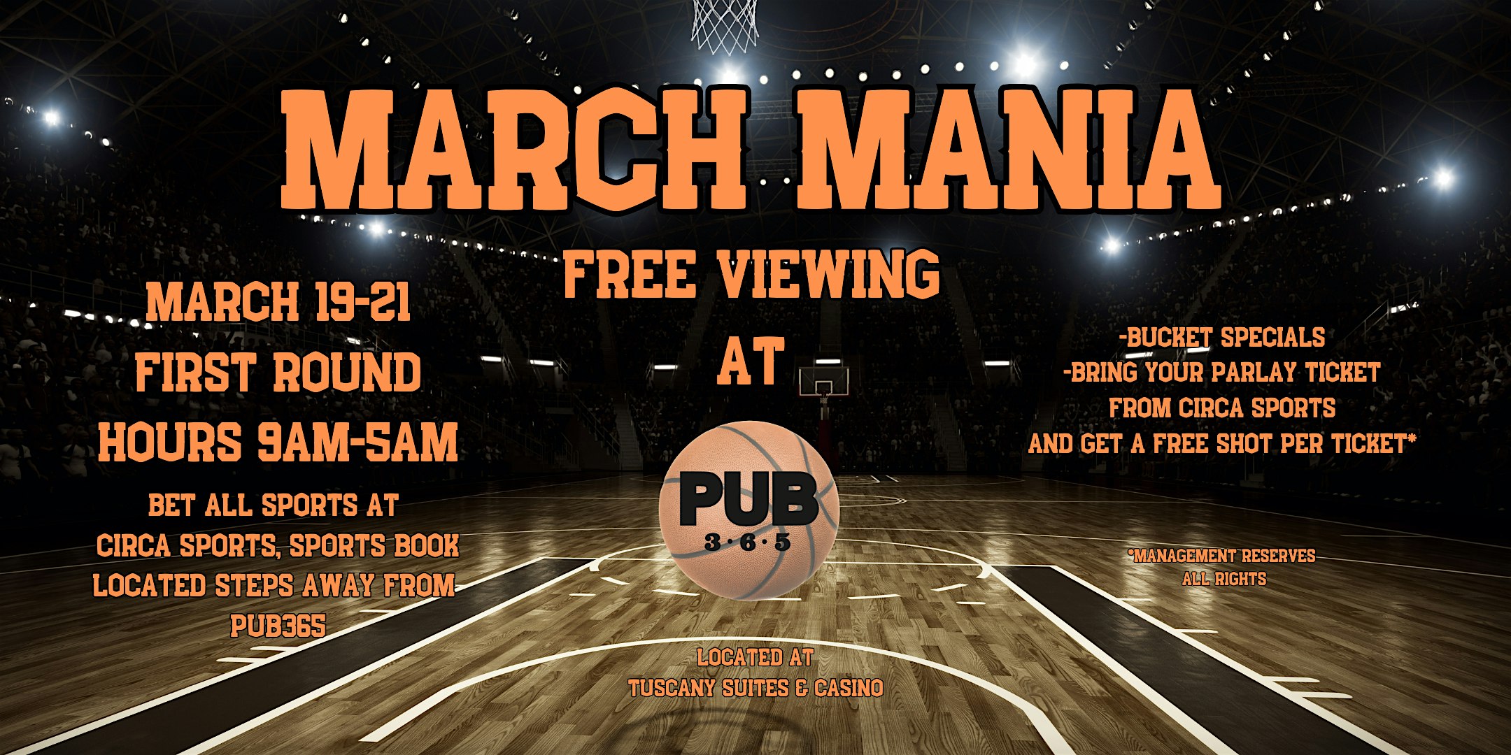 by admin24Feb March Mania at Pub365 – Tuscany Suites & Casino (Free Viewing) at Pub 365 – Las Vegas, NV March Mania at Pub365 – Tuscany Suites & Casino (Free Viewing) at Pub 365 – Las Vegas, NV 2 2 people viewed this event. Join us for a FREE viewing of March Mania games at Pub365 doors open at 9am. Located inside Tuscany Suites & Casino Tickets-RSVP Link Date And Time Thursday, March 19th, 2026 09:00 AM (PST) Venue Pub 365 Location 255 East Flamingo Road, Las Vegas, NV 89169 Event Types Food & DrinkParty or Social Gathering Event Category Las VegasNevada Share With Friends Facebook Twitter Linkedin Xing Pinterest Share This Post: