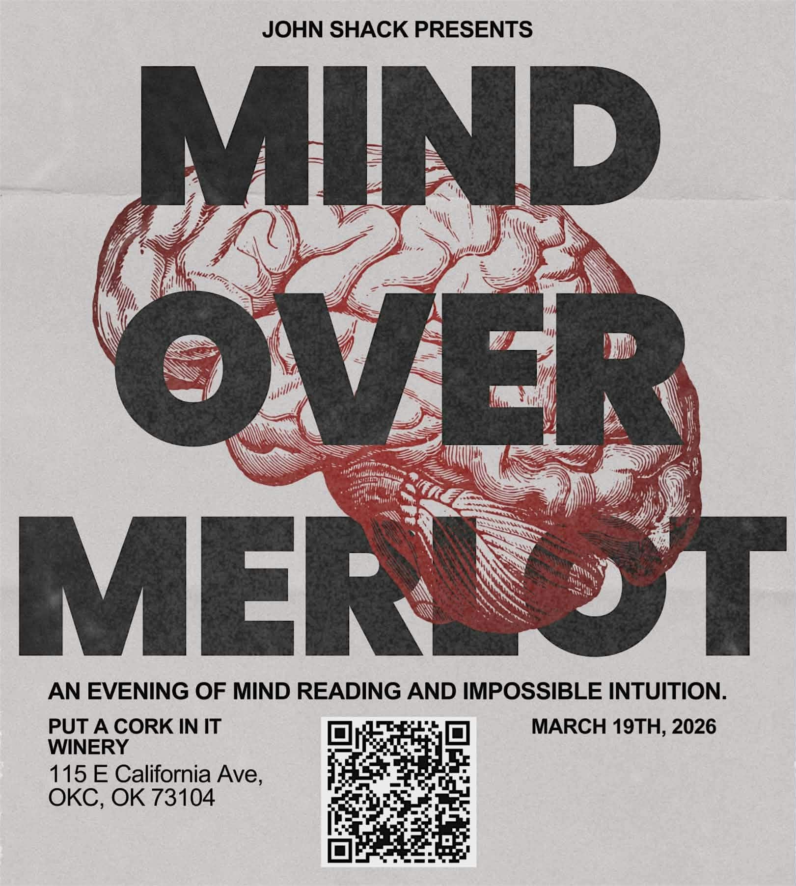 Mind Over Merlot at Put a Cork in It – Oklahoma City, OK Mind Over Merlot at Put a Cork in It – Oklahoma City, OK 2 2 people viewed this event. An evening of mind reading and impossible intuition. Tickets-RSVP Link Register for event Date And Time Thursday, March 19th, 2026 @ 07:00 PM Location 115 East California Avenue, Oklahoma City, OK 73104 Event Types Concert or PerformancePerforming & Visual Arts Event Category OklahomaOklahoma City Share With Friends Facebook Twitter Linkedin Xing Pinterest