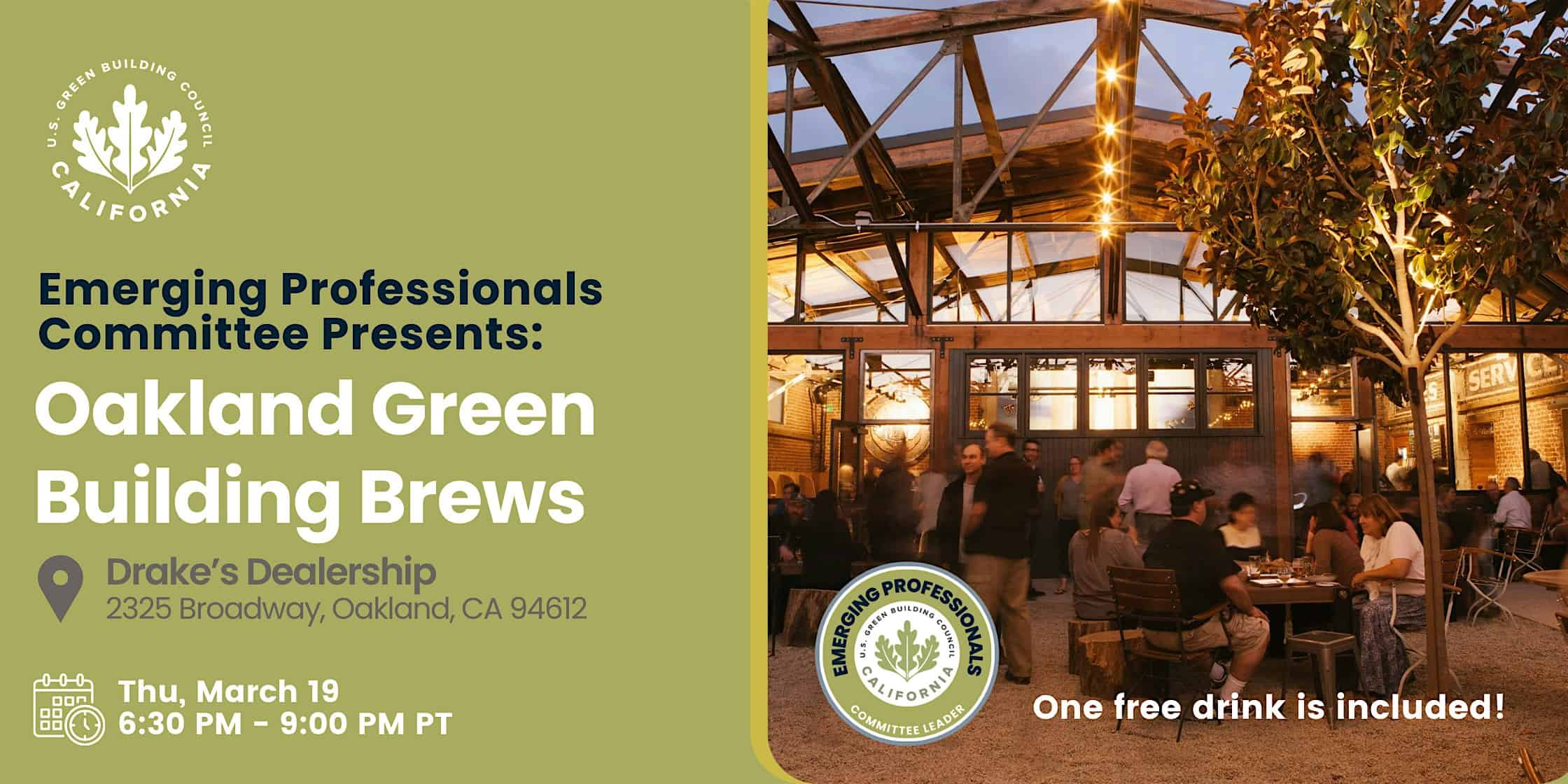 by admin23Feb Oakland Green Building Brews at Drake’s Dealership – Oakland, CA Oakland Green Building Brews at Drake’s Dealership – Oakland, CA 1 1 people viewed this event. Join our Emerging Professionals Committee for drinks, networking, and connection with sustainability professionals—one free drink included! Tickets-RSVP Link Date And Time Thursday, March 19th, 2026 06:00 PM (PST) Venue Drake's Dealership Location 2325 Broadway, Oakland, CA 94612 Event Types Community & CultureParty or Social Gathering Event Category CaliforniaOakland Share With Friends Facebook Twitter Linkedin Xing Pinterest Share This Post: