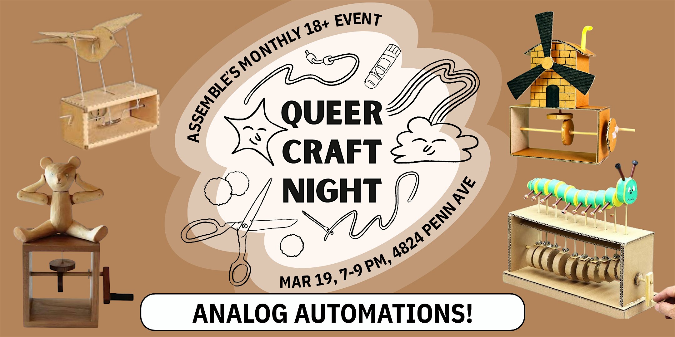 by admin13Feb Queer Craft Night – Analog Automations! at Assemble – Pittsburgh, PA Queer Craft Night – Analog Automations! at Assemble – Pittsburgh, PA 2 2 people viewed this event. Join us for our monthly Queer Craft Night! Learn how to build your very own crafty hand-cranking automation! Tickets-RSVP Link Date And Time Thursday, March 19th, 2026 11:00 PM (PST) Venue Assemble Location 4824 Penn Avenue, Pittsburgh, PA 15224 Event Types Community & CultureParty or Social Gathering Event Category PennsylvaniaPittsburgh Share With Friends Facebook Twitter Linkedin Xing Pinterest Share This Post: