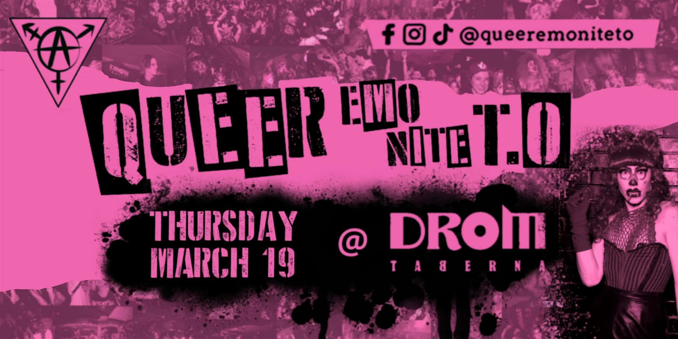 by admin23Feb Queer Emo Nite TO V.22 at DROM Taberna – Toronto, Canada Queer Emo Nite TO V.22 at DROM Taberna – Toronto, Canada 1 1 people viewed this event. Toronto’s queerest, saddest and wildest party, bring your most fabulous outfits down to the mosh pit and make some new queer sad friends! Tickets-RSVP Link Date And Time Thursday, March 19th, 2026 10:00 PM (PST) Venue DROM Taberna Location 458 Queen Street West, Toronto, Canada M5V 2A8 Event Types Community & CultureParty or Social Gathering Event Category CanadaToronto Share With Friends Facebook Twitter Linkedin Xing Pinterest Share This Post: