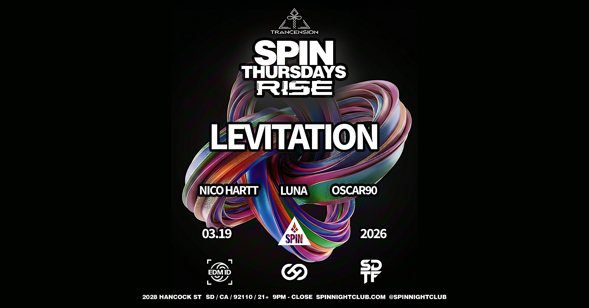 by admin27Feb Rise: Trance Thursday – Levitation w/ Oscar909, Luna, Nico Hartt at Spin Nightclub – San Diego, CA Rise: Trance Thursday – Levitation w/ Oscar909, Luna, Nico Hartt at Spin Nightclub – San Diego, CA 1 1 people viewed this event. Get ready to vibe and levitate with Oscar909, Luna, and Nico Hartt spinning the best trance beats live! Tickets-RSVP Link Date And Time Thursday, March 19th, 2026 09:00 PM (PST) Venue Spin Nightclub Location 2028 Hancock Street, San Diego, CA 92110 Event Types Concert or PerformanceMusic Event Category CaliforniaSan Diego Share With Friends Facebook Twitter Linkedin Xing Pinterest Share This Post: