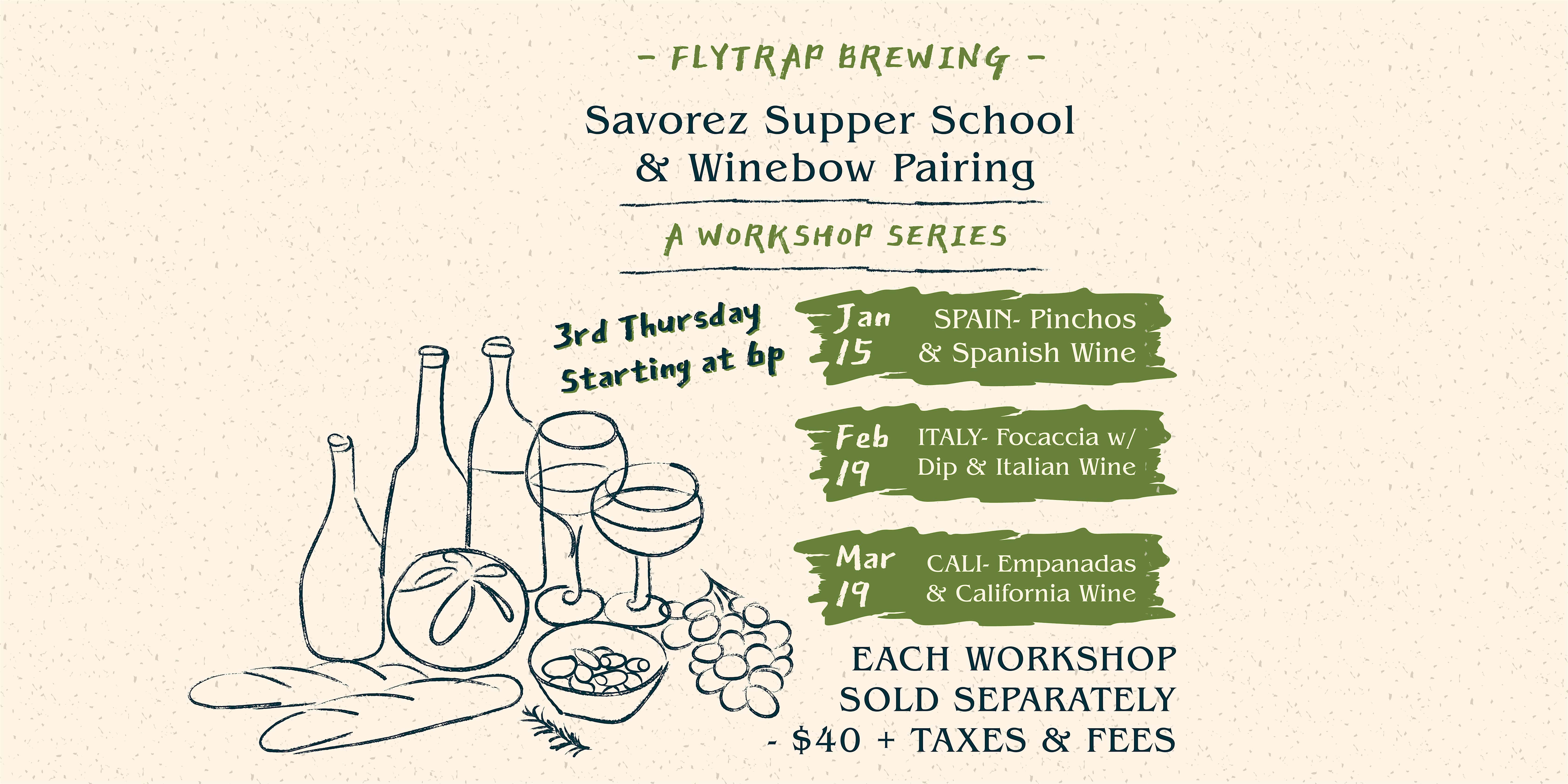 by admin14Feb Savorez Supper School & Winebow Pairing: A Workshop Series at Flytrap Brewing – Wilmington, NC Savorez Supper School & Winebow Pairing: A Workshop Series at Flytrap Brewing – Wilmington, NC 2 2 people viewed this event. Flytrap Brewing presents a collaborative three-part culinary & wine workshop series. Tickets-RSVP Link Date And Time Thursday, March 19th, 2026 10:00 PM (PST) Venue Flytrap Brewing Location 319 Walnut Street, Wilmington, NC 28401 Event Types Food & Drink Event Category North Carolina Share With Friends Facebook Twitter Linkedin Xing Pinterest Share This Post: