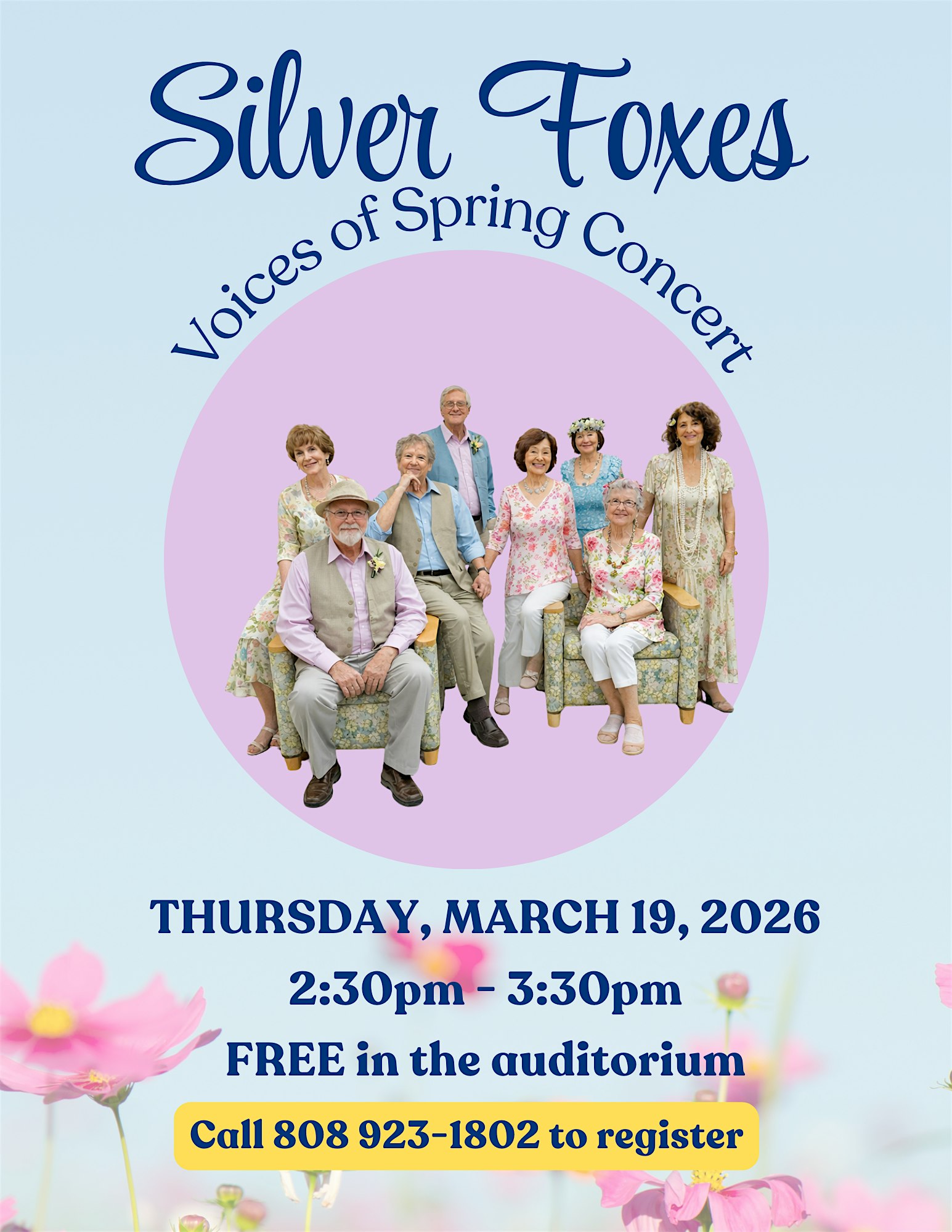 by admin05Mar Silver Foxes: Voices of Spring at Waikiki Community Center – Honolulu, HI Silver Foxes: Voices of Spring at Waikiki Community Center – Honolulu, HI 3 3 people viewed this event. Join us for Silver Foxes: Voices of Spring, where wisdom meets fun in a vibrant in-person gathering! Tickets-RSVP Link Date And Time Thursday, March 19th, 2026 02:00 PM (PST) Venue Waikiki Community Center Location 310 Paoakalani Avenue, Honolulu, HI 96815 Event Types Concert or PerformancePerforming & Visual Arts Event Category HawaiiHonolulu Share With Friends Facebook Twitter Linkedin Xing Pinterest Share This Post: