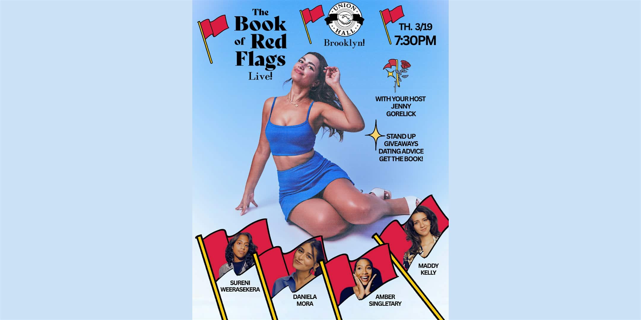 by admin14Feb The Book of Red Flags Live! at Union Hall – Brooklyn, NY The Book of Red Flags Live! at Union Hall – Brooklyn, NY 2 2 people viewed this event. The Book of Red Flags Live! – Thursday, March 19 – 7:00pm Doors / 7:30pm Show Tickets-RSVP Link Date And Time Thursday, March 19th, 2026 11:00 PM (PST) Venue Union Hall Location 702 Union St., Brooklyn, NY 11215 Event Types Concert or PerformancePerforming & Visual Arts Event Category New York Share With Friends Facebook Twitter Linkedin Xing Pinterest Share This Post: