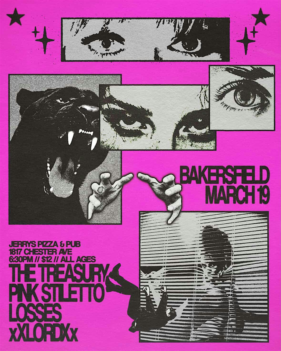 by admin24Feb The Treasury + Pink Stiletto + Losses +xXLordXx at Jerry’s Pizza & Pub – Bakersfield, CA The Treasury + Pink Stiletto + Losses +xXLordXx at Jerry’s Pizza & Pub – Bakersfield, CA 2 2 people viewed this event. Live music at Jerrys Pizza & Pub with The Treasury, Pink Stiletto, Losses, && xXLordxx . MARCH 19TH DOORS AT 6:30 PM $12 ENTRY FEE. ALL AGES Tickets-RSVP Link Date And Time Thursday, March 19th, 2026 06:00 PM (PST) Venue Jerry's Pizza & Pub Location 1817 Chester Ave, Bakersfield, CA 93301 Event Types Concert or PerformanceMusic Event Category California Share With Friends Facebook Twitter Linkedin Xing Pinterest Share This Post: