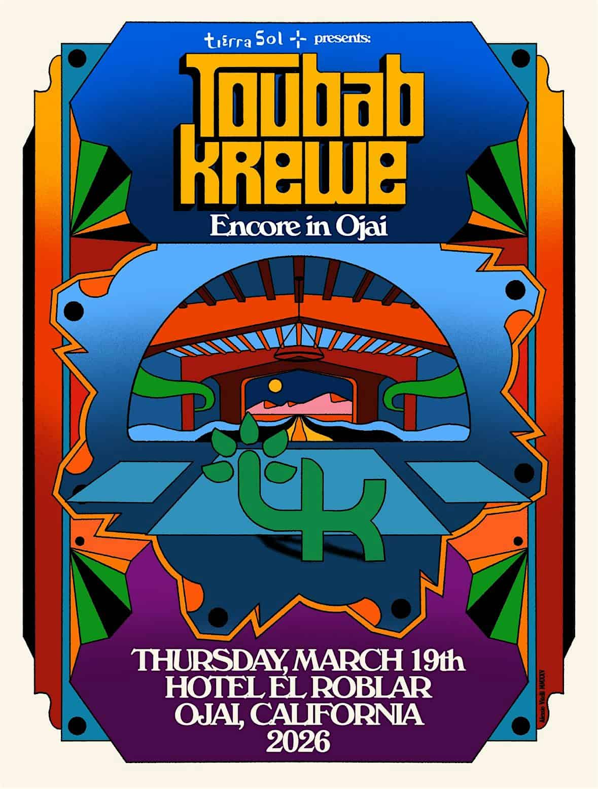 by admin23Feb Tierra Sol presents: Toubab Krewe Encore in Ojai at Hotel El Roblar – Ojai, CA Tierra Sol presents: Toubab Krewe Encore in Ojai at Hotel El Roblar – Ojai, CA 3 3 people viewed this event. Back by popular demand, Toubab Krewe brings their 20th Anniversary tour of their unique fusion of West African rhythms to Hotel El Roblar. Tickets-RSVP Link Date And Time Thursday, March 19th, 2026 06:00 PM (PST) Venue Hotel El Roblar Location 122 East Ojai Avenue, Ojai, CA 93023 Event Types Concert or PerformanceMusic Event Category California Share With Friends Facebook Twitter Linkedin Xing Pinterest Share This Post: