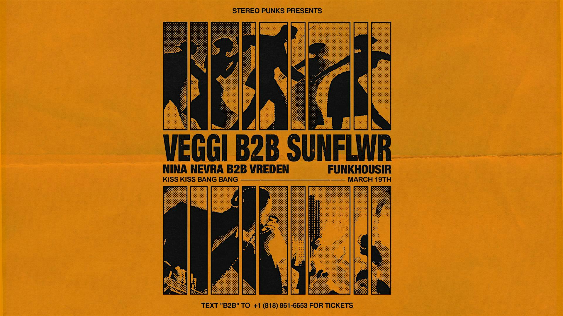 by admin27Feb Veggi + Sunflwr in L.A. at Kiss Kiss Bang Bang – Los Angeles, CA Veggi + Sunflwr in L.A. at Kiss Kiss Bang Bang – Los Angeles, CA 1 1 people viewed this event. Veggi + Sunflwr together in Los Angeles. Tickets-RSVP Link Date And Time Thursday, March 19th, 2026 @ 09:00 PM Location 3531 Wilshire Blvd, Los Angeles, CA 90010 Event Types Concert or PerformanceMusic Event Category CaliforniaLos Angeles Share With Friends Facebook Twitter Linkedin Xing Pinterest Share This Post: