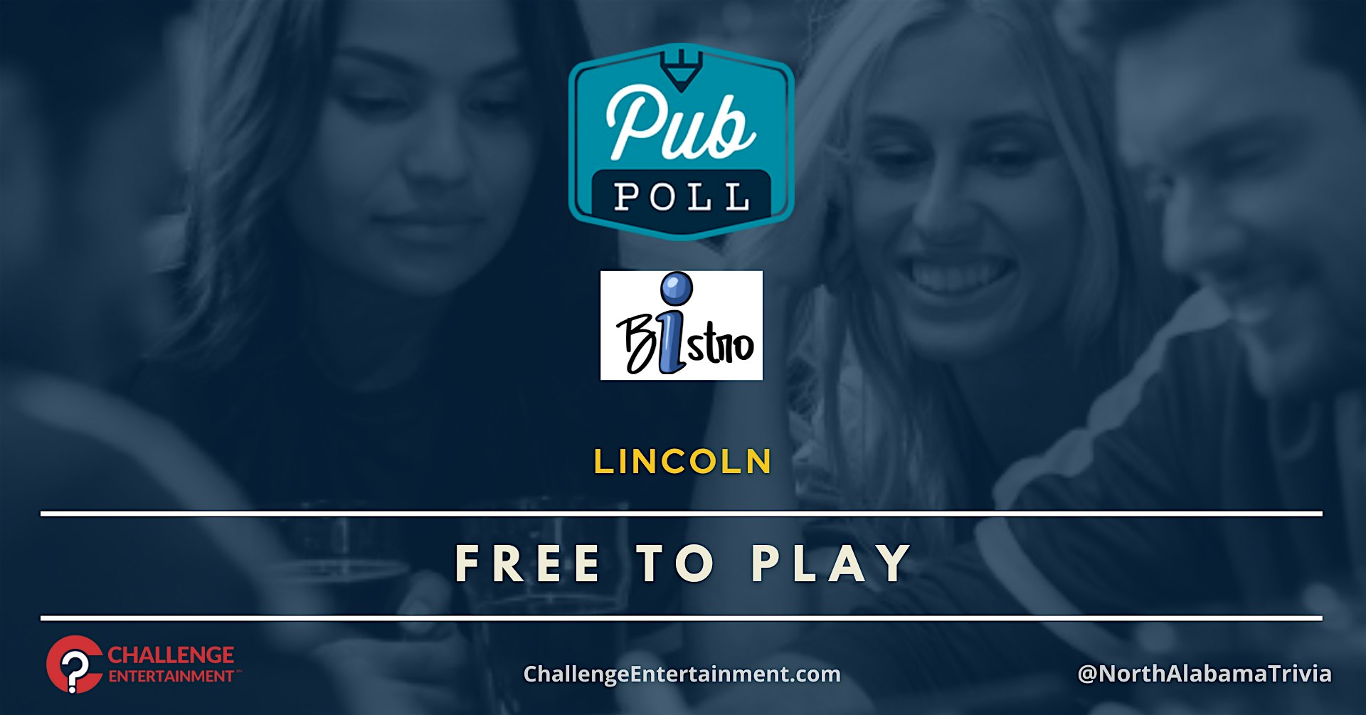 Weekly Pub Poll Game Nights at Blue i Bistro – Lincoln at Blue i Bistro – Lincoln, AL Weekly Pub Poll Game Nights at Blue i Bistro – Lincoln at Blue i Bistro – Lincoln, AL 1 1 people viewed this event. Weekly Pub Poll Game Nights at Blue i Bistro – Lincoln Tickets-RSVP Link Register for event Date And Time Thursday, March 19th, 2026 @ 06:00 PM Location 5 Crawford Street, Lincoln, ALĀ 35096 Event Types Food & DrinkGame or Competition Event Category Alabama Share With Friends Facebook Twitter Linkedin Xing Pinterest