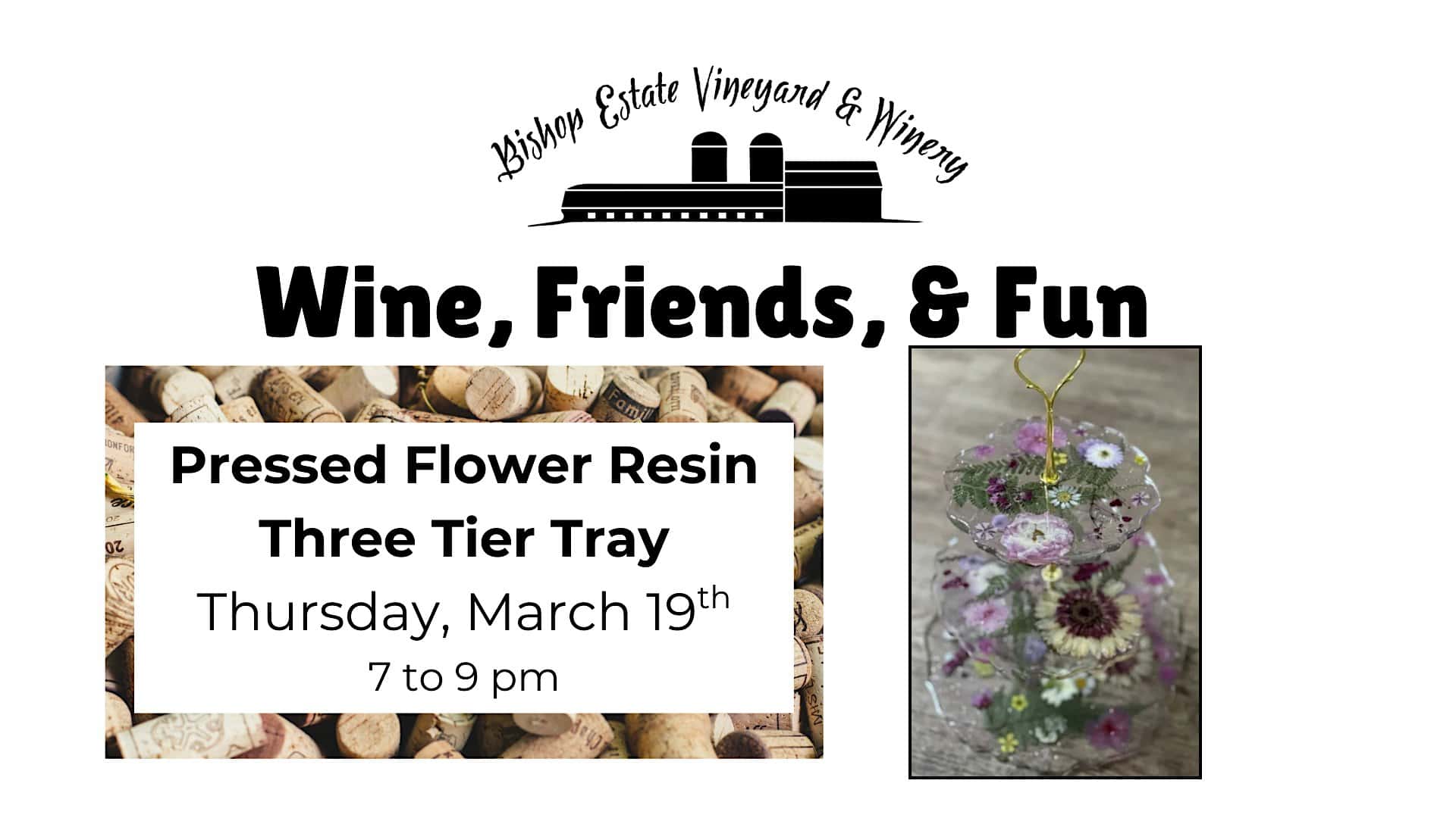 by admin14Feb Wine, Friends, & Fun: Pressed Flower Resin Three Tier Tray at Bishop Estate Vineyard and Winery – Perkasie, PA Wine, Friends, & Fun: Pressed Flower Resin Three Tier Tray at Bishop Estate Vineyard and Winery – Perkasie, PA 1 1 people viewed this event. Come and create a unique pressed-flower resin three tier tray in a fun, hands-on workshop led by instructor Carrie B! Tickets-RSVP Link Date And Time Thursday, March 19th, 2026 11:00 PM (PST) Venue Bishop Estate Vineyard and Winery Location 2730 Hilltown Pike, Perkasie, PA 18944 Event Types Food & Drink Event Category Pennsylvania Share With Friends Facebook Twitter Linkedin Xing Pinterest Share This Post: