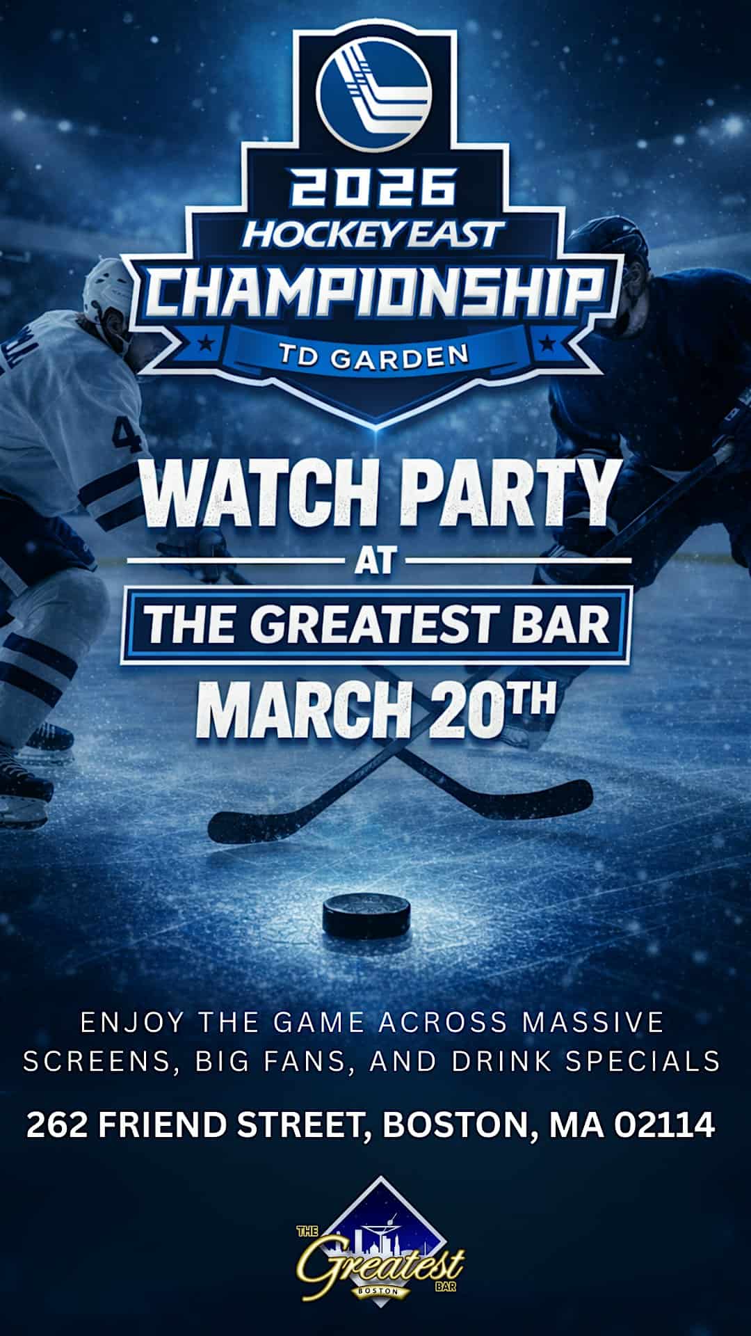 by admin05Mar 2026 Hockey East Semi Finals After Party at The Greatest Bar – Boston, MA 2026 Hockey East Semi Finals After Party at The Greatest Bar – Boston, MA 4 4 people viewed this event. Join us at The Greatest Bar to watch the game OR join us for the after party | Just steps from the TD Garden | Fri March 20th Tickets-RSVP Link Date And Time Friday, March 20th, 2026 08:00 PM (PDT) Venue The Greatest Bar Location 262 Friend Street, Boston, MA 2114 Event Types Party or Social GatheringSeasonal & Holiday Event Category BostonMassachusetts Share With Friends Facebook Twitter Linkedin Xing Pinterest Share This Post: