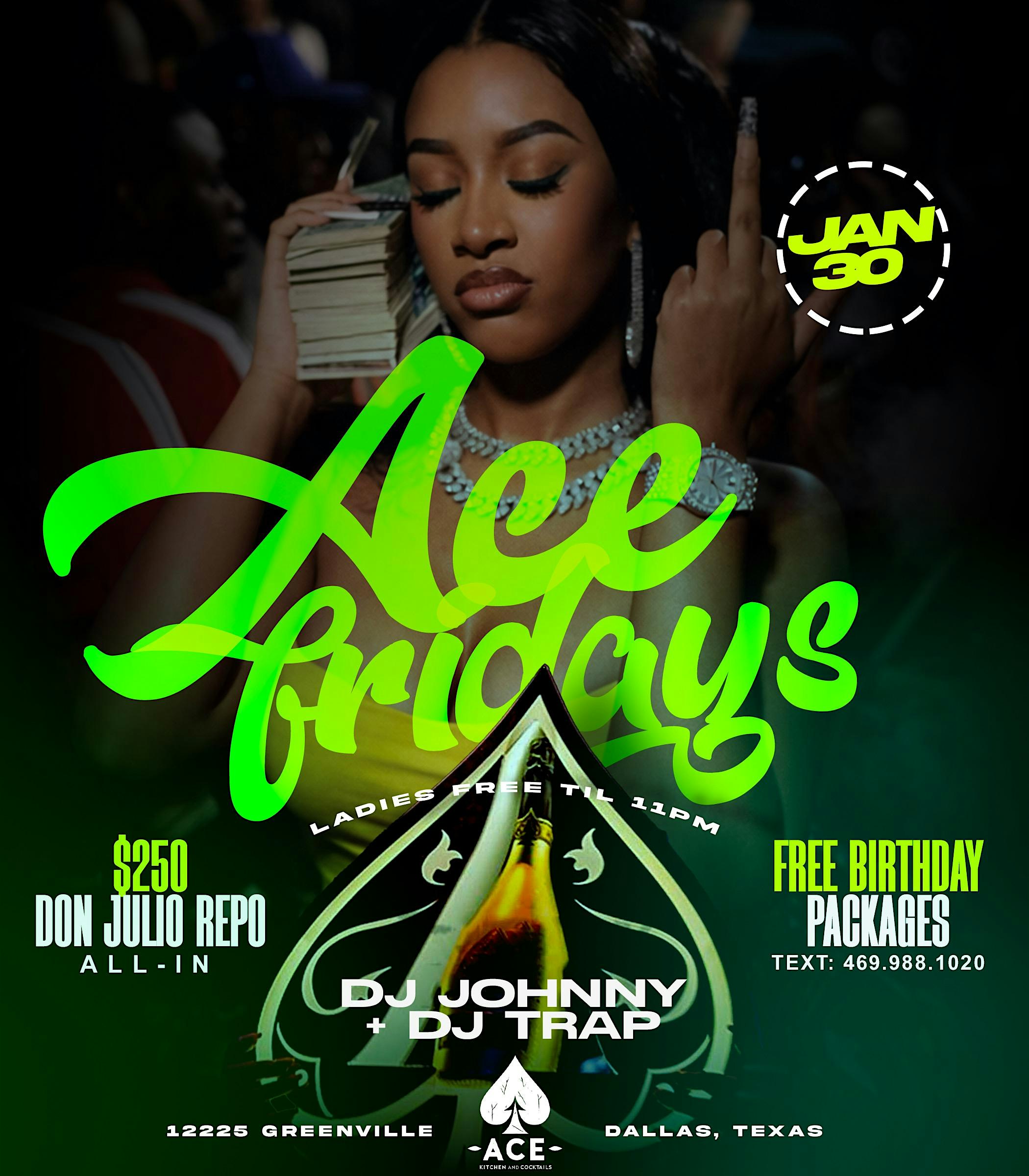 by admin24Feb Ace Fridays at Ace Lounge – Dallas, TX Ace Fridays at Ace Lounge – Dallas, TX 3 3 people viewed this event. Join us for Ace Fridays, where the drinks are cold, the music is hot, and the vibes are always on point! Tickets-RSVP Link Date And Time Friday, March 20th, 2026 10:00 PM (PST) Venue Ace Lounge Location 12225 Greenville Ave, Dallas, TX 75243 Event Types MusicParty or Social Gathering Event Category DallasTexas Share With Friends Facebook Twitter Linkedin Xing Pinterest Share This Post: