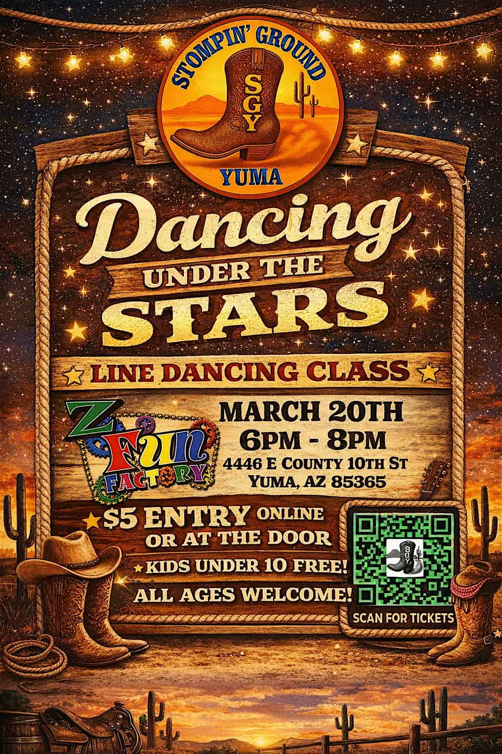 by admin23Feb Dancing Under the Stars! at Z Fun Factory – Back Patio – Yuma, AZ Dancing Under the Stars! at Z Fun Factory – Back Patio – Yuma, AZ 2 2 people viewed this event. Get ready to groove at Dancing Under the Stars! Throw on your boots, bring your moves and shine bright! Tickets-RSVP Link Date And Time Friday, March 20th, 2026 06:00 PM (PST) Venue Z Fun Factory - Back Patio Location 4446 East County 10th Street, Yuma, AZ 85365 Event Types Party or Social GatheringPerforming & Visual Arts Event Category Arizona Share With Friends Facebook Twitter Linkedin Xing Pinterest Share This Post: