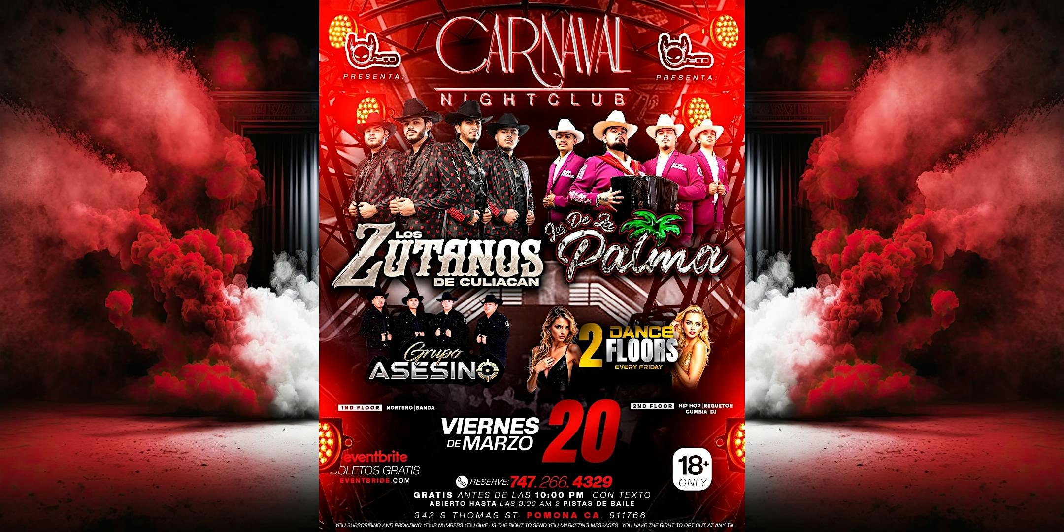 by admin27Feb Friday Night Marzo 20 – Banda, Norteño, y Reggaeton at Carnaval Nightclub – Pomona, CA Friday Night Marzo 20 – Banda, Norteño, y Reggaeton at Carnaval Nightclub – Pomona, CA 1 1 people viewed this event. !Ven a bailar con música en vivo de banda, norteño y reggaeton este Viernes 20 de Marzo! Tickets-RSVP Link Date And Time Friday, March 20th, 2026 09:00 PM (PST) Venue Carnaval Nightclub Location 342 South Thomas Street, Pomona, CA 91766 Event Types Concert or PerformanceMusic Event Category California Share With Friends Facebook Twitter Linkedin Xing Pinterest Share This Post:
