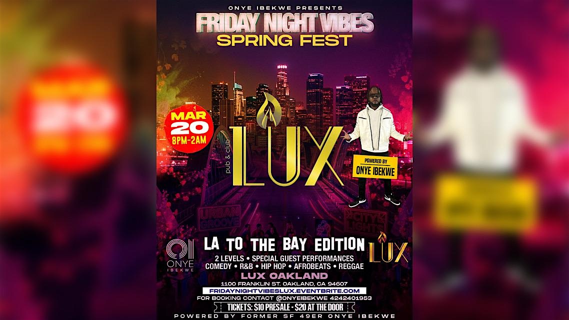 by admin05Mar Friday Night Vibes LA To The Bay Spring Fest @ LUX (8p-2a) 2 LEVELS! 200+ at Lux Oakland – Oakland, CA Friday Night Vibes LA To The Bay Spring Fest @ LUX (8p-2a) 2 LEVELS! 200+ at Lux Oakland – Oakland, CA 2 2 people viewed this event. Join Us For Friday Night Vibes LA To The Bay Spring Fest Edition @ LUX. This Monthly Event Features Vibes From LA To The Bay Under 1 Roof. Tickets-RSVP Link Date And Time Friday, March 20th, 2026 08:00 PM (PST) Venue Lux Oakland Location 1100 Franklin Street, Oakland, CA 94607 Event Types MusicParty or Social Gathering Event Category CaliforniaOakland Share With Friends Facebook Twitter Linkedin Xing Pinterest Share This Post:
