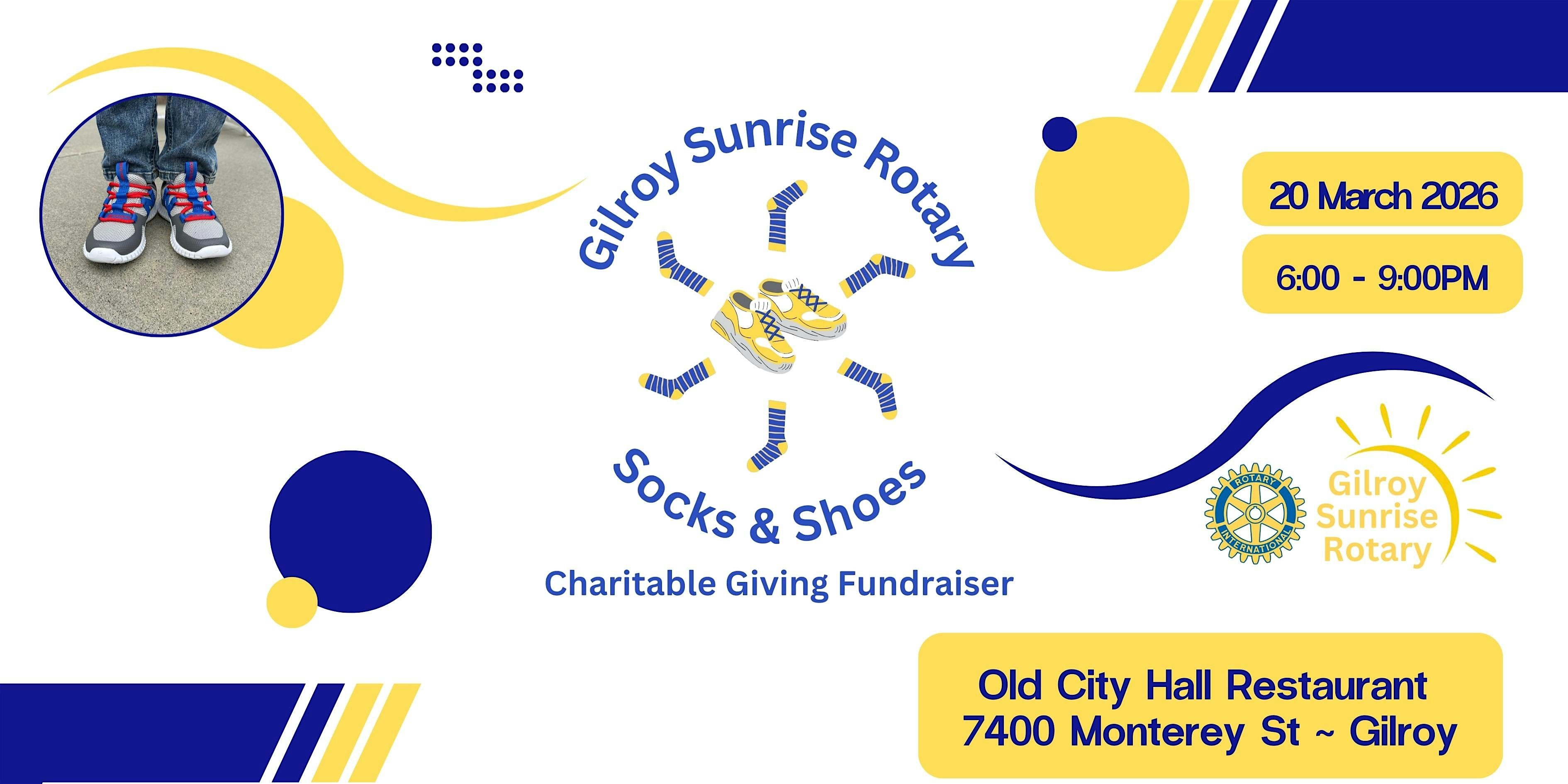 by admin27Feb Gilroy Sunrise Rotary – Socks & Shoes Fundraiser. at Old City Hall Restaurant – Gilroy, CA Gilroy Sunrise Rotary – Socks & Shoes Fundraiser. at Old City Hall Restaurant – Gilroy, CA 1 1 people viewed this event. This important event will benefit local youth providing footwear, socks, sports equipment and blankets to those in need in our Community. Tickets-RSVP Link Date And Time Friday, March 20th, 2026 @ 06:00 PM Location 7400 Monterey Road, Gilroy, CA 95020 Event Types Charity & CausesParty or Social Gathering Event Category California Share With Friends Facebook Twitter Linkedin Xing Pinterest Share This Post:
