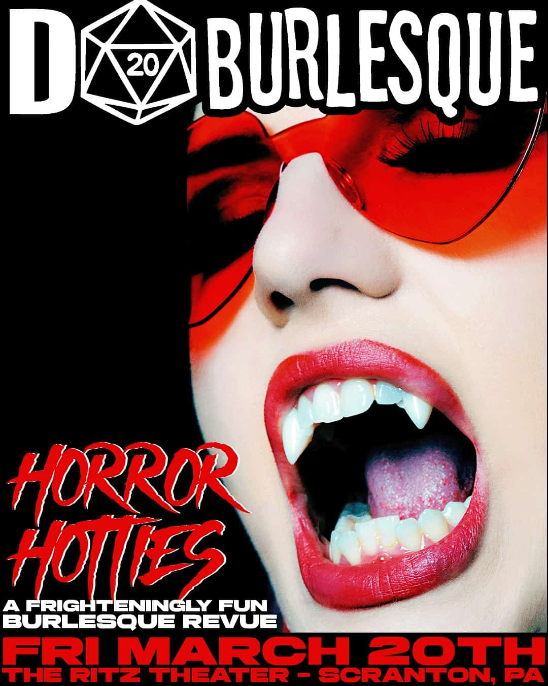 by admin14Feb Horror Hotties: A Burlesque Tribute to Horror at Ritz Theater and Performing Arts Center – Scranton, PA Horror Hotties: A Burlesque Tribute to Horror at Ritz Theater and Performing Arts Center – Scranton, PA 2 2 people viewed this event. Get ready for a night of spooky seduction as Horror Hotties pay tribute to the best of horror through burlesque performances! Tickets-RSVP Link Date And Time Friday, March 20th, 2026 11:00 PM (PST) Venue Ritz Theater and Performing Arts Center Location 222 Wyoming Avenue, Scranton, PA 18503 Event Types Concert or PerformancePerforming & Visual Arts Event Category Pennsylvania Share With Friends Facebook Twitter Linkedin Xing Pinterest Share This Post: