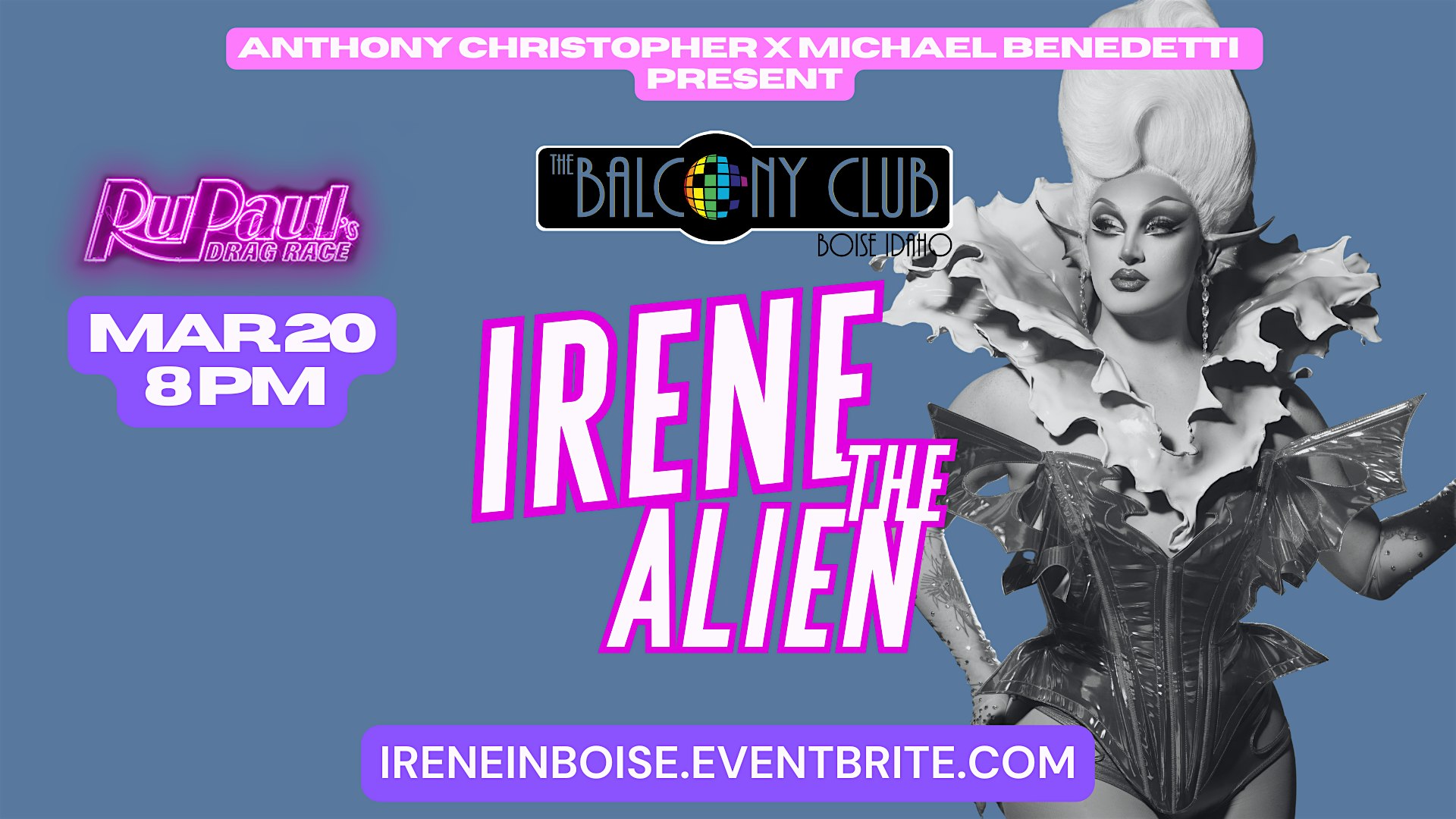 by admin27Feb Irene the Alien at The Balcony Club – Boise at The Balcony Club – Boise, ID Irene the Alien at The Balcony Club – Boise at The Balcony Club – Boise, ID 2 2 people viewed this event. RuPaul’s Drag Race Season All Star, Irene the Alien is coming to The Balcony Club in Boise, Idaho! Tickets-RSVP Link Date And Time Friday, March 20th, 2026 @ 08:00 PM Location 150 North 8th Street, Boise, ID 83702 Event Types Party or Social GatheringPerforming & Visual Arts Event Category BoiseIdaho Share With Friends Facebook Twitter Linkedin Xing Pinterest Share This Post:
