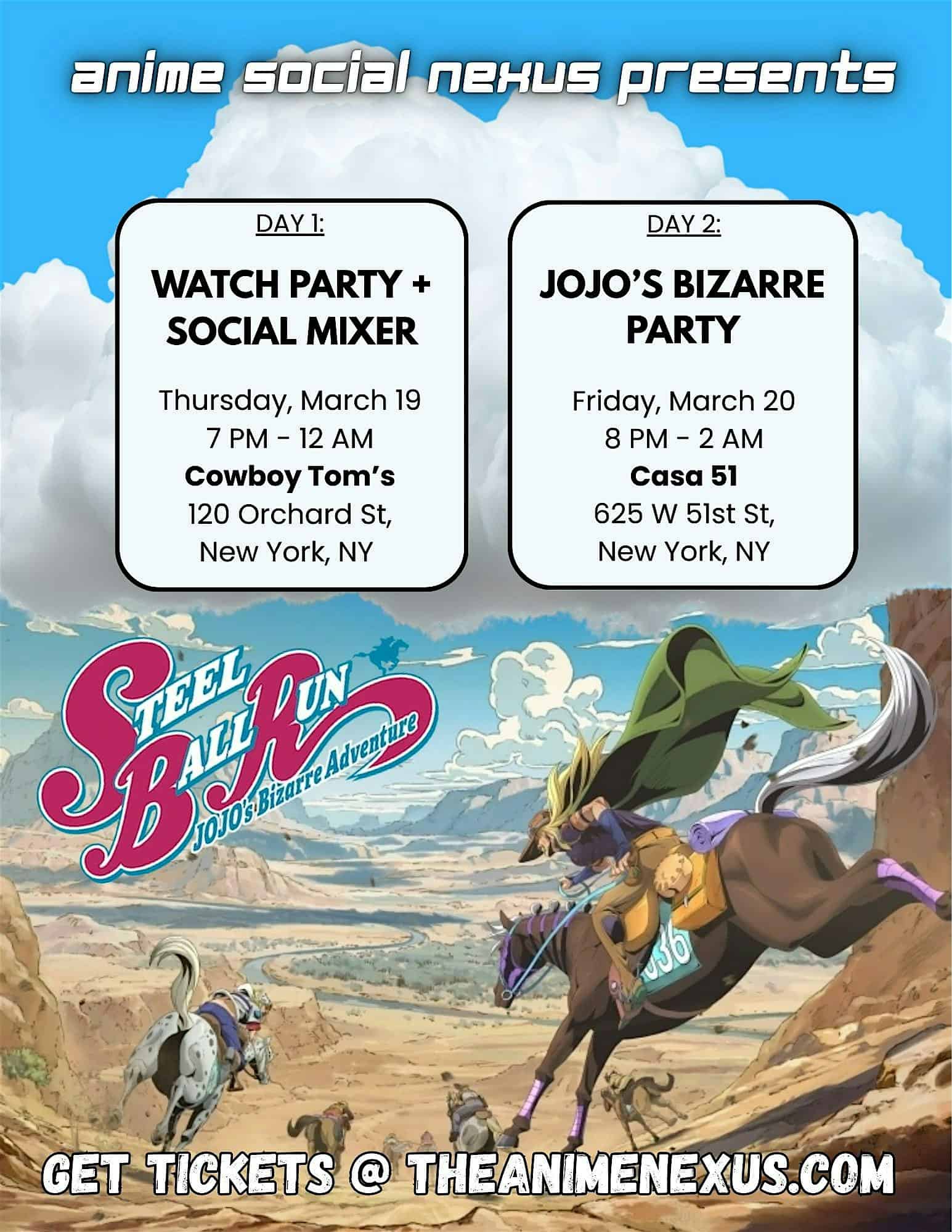 by admin23Feb JOJO’S BIZARRE PARTY at Casa 51 – New York, NY JOJO’S BIZARRE PARTY at Casa 51 – New York, NY 1 1 people viewed this event. Join us for JOJO’S BIZARRE PARTY, a fun and good-hearted chaos-filled night celebrating the release of Steel Ball Run and all things JJBA! Tickets-RSVP Link Date And Time Friday, March 20th, 2026 @ 08:00 PM Location 625 West 51st Street, New York, NY 10019 Event Types Film, Media & EntertainmentParty or Social Gathering Event Category New YorkNew York City Share With Friends Facebook Twitter Linkedin Xing Pinterest Share This Post:
