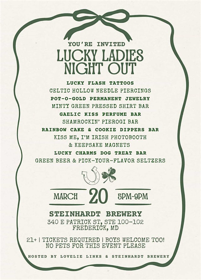 by admin05Mar Lucky Ladies Night Out! at Steinhardt Brewing Company – Frederick, MD Lucky Ladies Night Out! at Steinhardt Brewing Company – Frederick, MD 3 3 people viewed this event. Join us for a Shamrockin’ fun night! Tickets-RSVP Link Date And Time Friday, March 20th, 2026 05:00 PM (PDT) Venue Steinhardt Brewing Company Location 340 East Patrick Street, Frederick, MD 21701 Event Types Fashion & BeautyParty or Social Gathering Event Category Maryland Share With Friends Facebook Twitter Linkedin Xing Pinterest Share This Post: