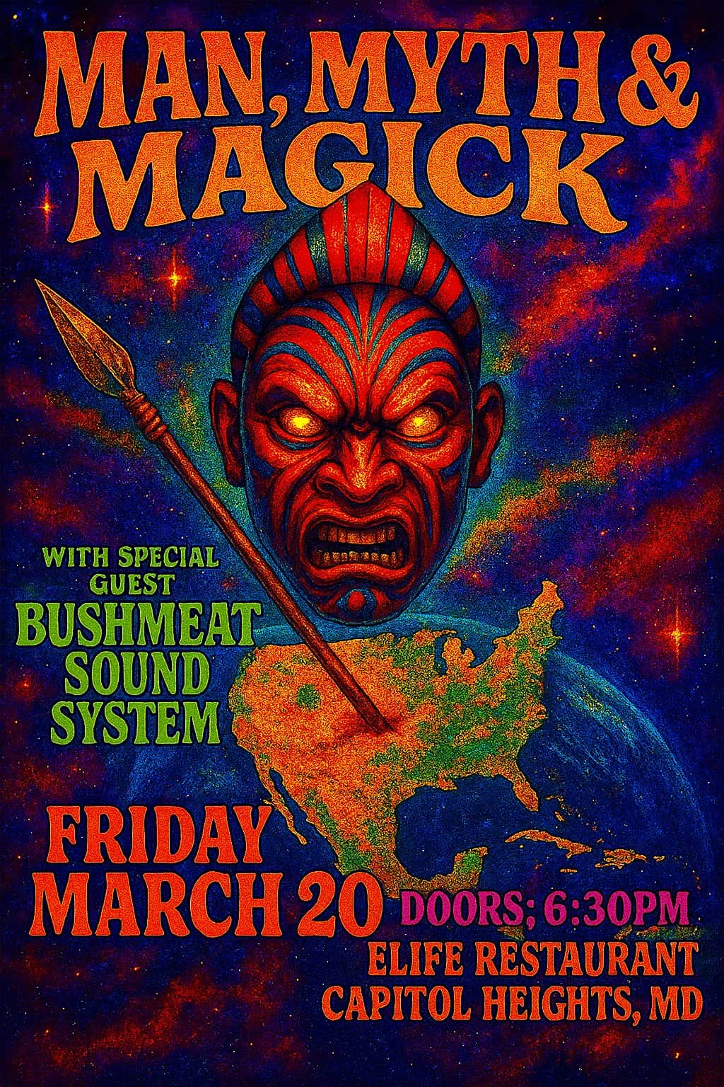 Man, Myth & Magick with Special Guest Bushmeat Sound System at ELife Restaurant (Everlasting Life Vegan Restaurant) – Capitol Heights, MD