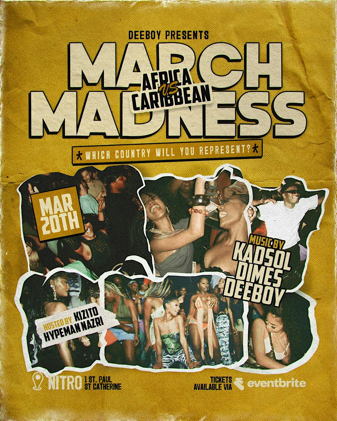 by admin05Mar MARCH MADNESS HOSTED BY DEEBOY at NITRO – St. Catharines, Canada MARCH MADNESS HOSTED BY DEEBOY at NITRO – St. Catharines, Canada 4 4 people viewed this event. AFRICA VS CARIBBEAN “Which country will you represent ” MARCH 20 FRIDAY NITRO 1 St. Paul St Catherine KADSOL X DIMES X DEEBOY Tickets-RSVP Link Date And Time Friday, March 20th, 2026 10:00 PM (PDT) Venue NITRO Location 1 Saint Paul Street, St. Catharines, Canada L2R 7L2 Event Types MusicParty or Social Gathering Event Category Canada Share With Friends Facebook Twitter Linkedin Xing Pinterest Share This Post: