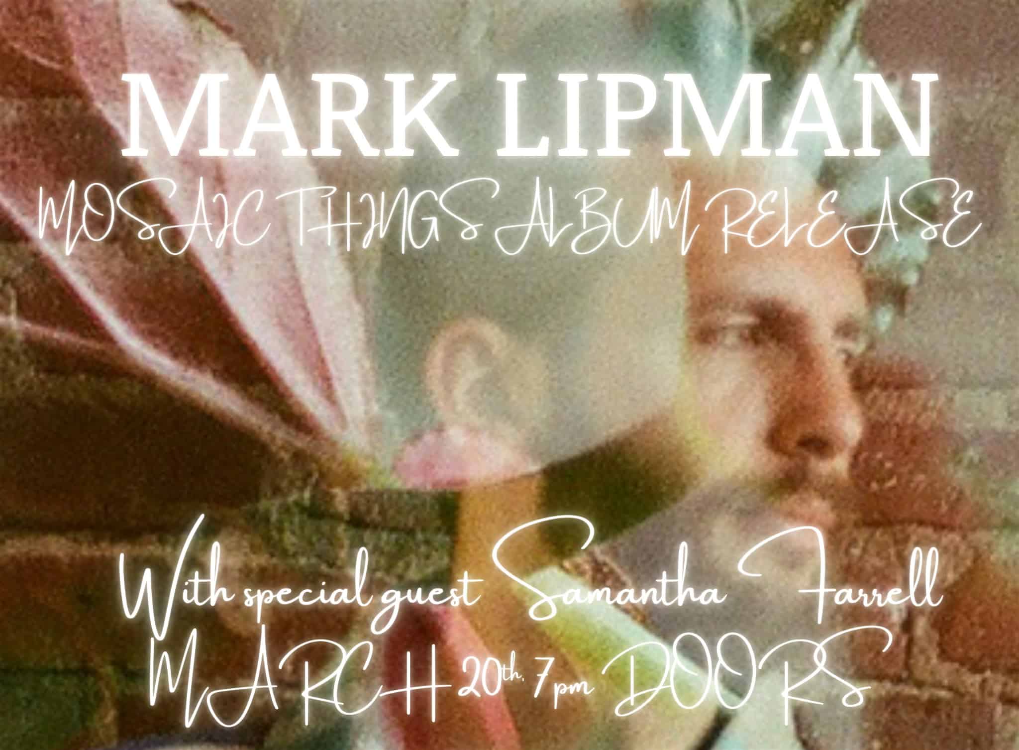 by admin23Feb Mark Lipman “Mosaic Things” Release With Special Guest Samantha Farrell at Lizard Lounge – Cambridge, MA Mark Lipman “Mosaic Things” Release With Special Guest Samantha Farrell at Lizard Lounge – Cambridge, MA 1 1 people viewed this event. Singer Songwriter Mark Lipman celebrates the release of “Mosaic Things” March 20th at the Lizard Lounge with Samantha Farrell! Tickets-RSVP Link Date And Time Friday, March 20th, 2026 08:00 PM (PST) Venue Lizard Lounge Location 1667 Massachusetts Avenue, Cambridge, MA 2138 Event Types Concert or PerformanceMusic Event Category Massachusetts Share With Friends Facebook Twitter Linkedin Xing Pinterest Share This Post: