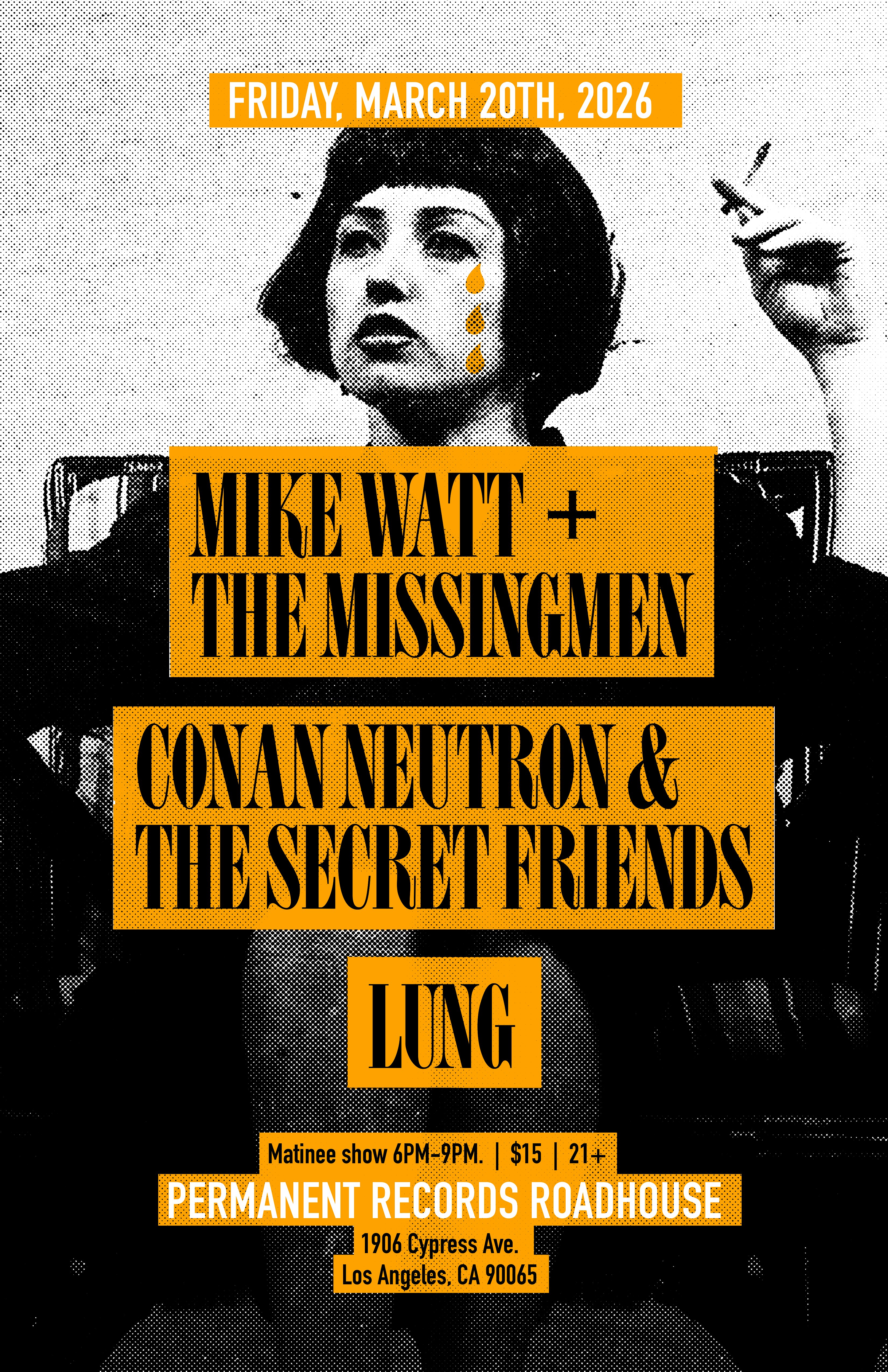 by admin24Feb Mike Watt + The Missing Men, Conan Neutron & the Secret Friends, Lung at Permanent Records Roadhouse – Los Angeles, CA Mike Watt + The Missing Men, Conan Neutron & the Secret Friends, Lung at Permanent Records Roadhouse – Los Angeles, CA 2 2 people viewed this event. This event is 21+ only. We will check IDs at the door. There are no refunds if you are turned away. Tickets-RSVP Link Date And Time Friday, March 20th, 2026 06:00 PM (PST) Venue Permanent Records Roadhouse Location 1906 Cypress Avenue, Los Angeles, CA 90065 Event Types Concert or PerformanceMusic Event Category CaliforniaLos Angeles Share With Friends Facebook Twitter Linkedin Xing Pinterest Share This Post: