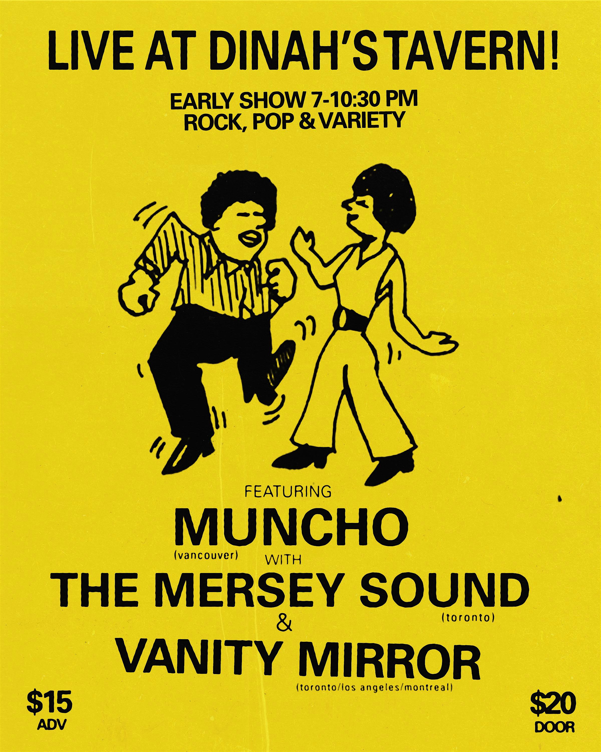 by admin13Feb Muncho + The Mersey Sound + Vanity Mirror at Dinah’s Tavern at Dinah’s Tavern – Toronto, Canada Muncho + The Mersey Sound + Vanity Mirror at Dinah’s Tavern at Dinah’s Tavern – Toronto, Canada 1 1 people viewed this event. Early Friday Pop Rock Review! Muncho, The Mersey Sound, and Vanity Mirror at Dinah’s Tavern 🙂 Tickets-RSVP Link Date And Time Friday, March 20th, 2026 11:00 PM (PST) Venue Dinah’s Tavern Location 486 Spadina Ave., Toronto, Canada M5S 2H1 Event Types Concert or PerformanceMusic Event Category CanadaToronto Share With Friends Facebook Twitter Linkedin Xing Pinterest Share This Post:
