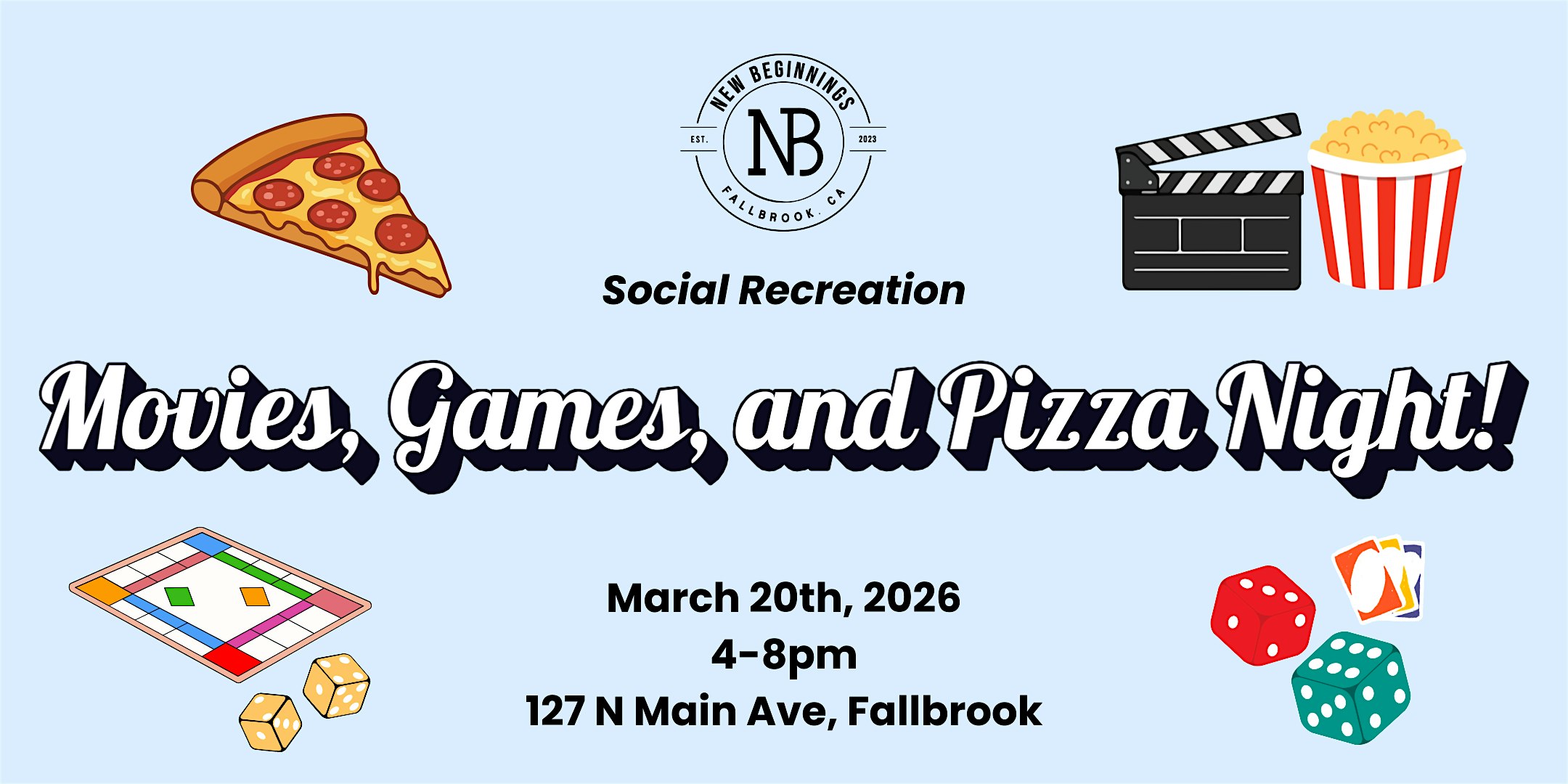 by admin05Mar New Beginnings Social Recreation at 127 N Main Ave – Fallbrook, CA New Beginnings Social Recreation at 127 N Main Ave – Fallbrook, CA 2 2 people viewed this event. Join us for good times and new friends at the New Beginnings Social Recreation—fun times ahead! Tickets-RSVP Link Date And Time Friday, March 20th, 2026 04:00 PM (PST) Venue 127 N Main Ave Location 127 North Main Avenue, Fallbrook, CA 92028 Event Types Community & CultureParty or Social Gathering Event Category California Share With Friends Facebook Twitter Linkedin Xing Pinterest Share This Post: