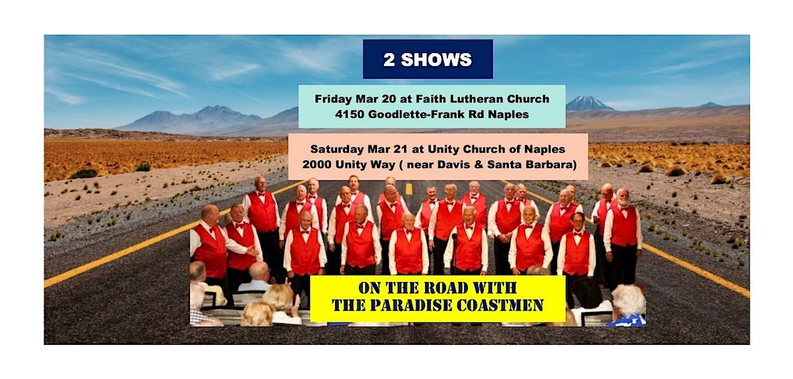 by admin24Feb On The Road with the Paradise Coastmen Barbershop Chorus at To Be Determined – UNKNOWN, FL On The Road with the Paradise Coastmen Barbershop Chorus at To Be Determined – UNKNOWN, FL 3 3 people viewed this event. FAMILY ENTERTAINMENT – bring the youngsters, the oldsters and everyone else for a fabulous evening of your favorite songs. Tickets-RSVP Link Date And Time Friday, March 20th, 2026 07:00 PM (PST) Venue To Be Determined Location 00 UNKNOWN, UNKNOWN, FL 0 Event Types Concert or PerformanceMusic Event Category Florida Share With Friends Facebook Twitter Linkedin Xing Pinterest Share This Post: