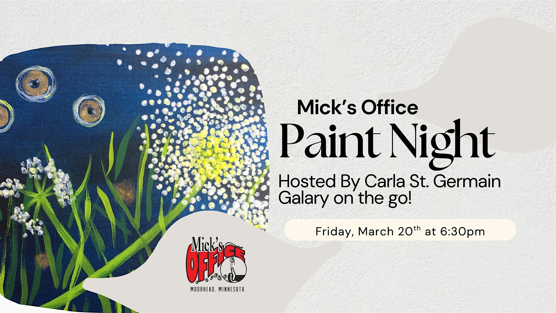 by admin27Feb Paint & Sip at Mick’s Office w/ Carla St. Germain at Mick’s Office – Moorhead, MN Paint & Sip at Mick’s Office w/ Carla St. Germain at Mick’s Office – Moorhead, MN 2 2 people viewed this event. Paint Night March 20, 6:30pm! No experience needed—Dandy Fireflies & drinks at Mick’s Office. ✨ Tickets-RSVP Link Date And Time Friday, March 20th, 2026 @ 06:00 PM Location 10 8th Street South, Moorhead, MN 56560 Event Types Party or Social Gathering Event Category Minnesota Share With Friends Facebook Twitter Linkedin Xing Pinterest Share This Post: