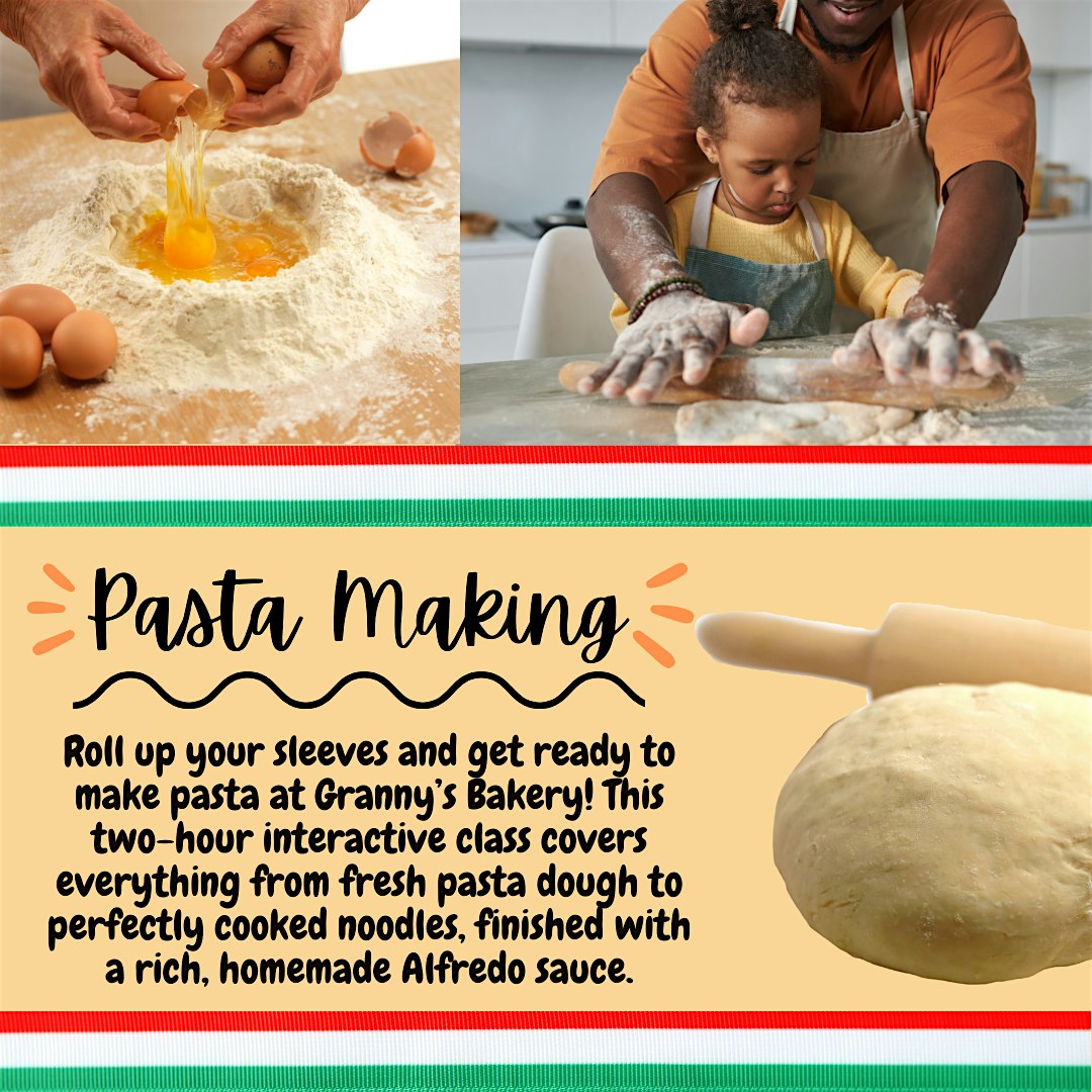 Hands-on pasta fun at Granny’s Bakery! Make fresh dough, cook pasta, and finish with homemade Alfredo in this delicious 2-hour class.