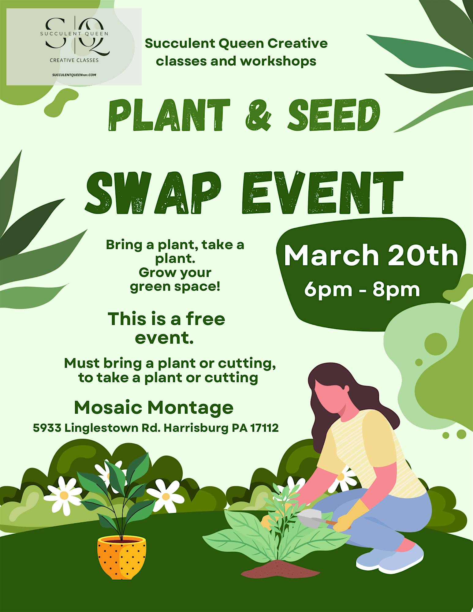 by admin27Feb Plant Swap at Mosaic Montage – Harrisburg, PA Plant Swap at Mosaic Montage – Harrisburg, PA 2 2 people viewed this event. Bring your plants, swap some cuttings, and meet fellow green thumbs in person! Tickets-RSVP Link Date And Time Friday, March 20th, 2026 @ 06:00 PM Location 5933 Linglestown Road, Harrisburg, PA 17112 Event Types Party or Social Gathering Event Category Pennsylvania Share With Friends Facebook Twitter Linkedin Xing Pinterest Share This Post: