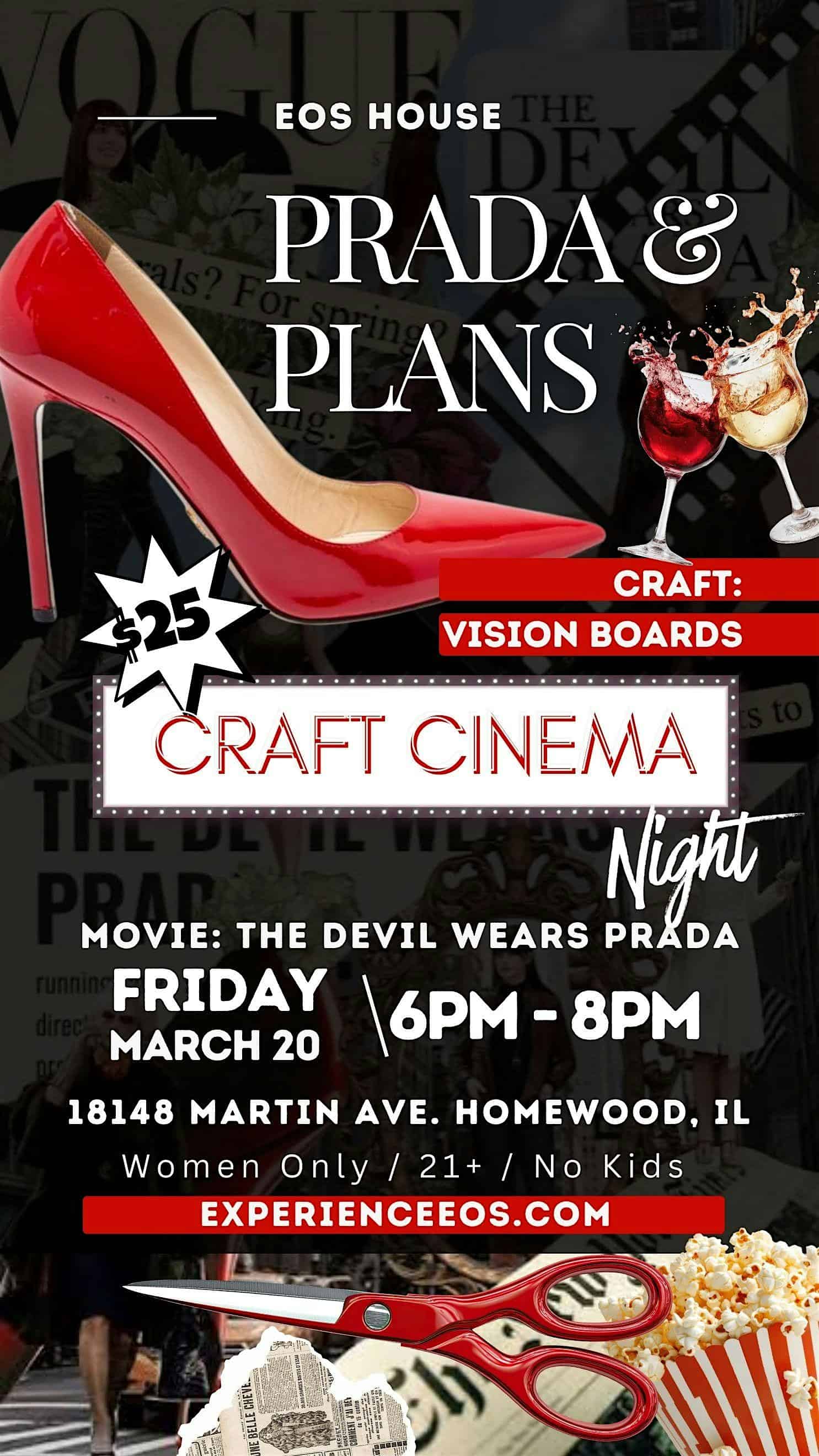 by admin05Mar Prada & Plans Craft Cinema Night at Experience Eos House – Homewood, IL Prada & Plans Craft Cinema Night at Experience Eos House – Homewood, IL 2 2 people viewed this event. A Cozy Creative Reset for Women (21+) Craft: Vision Boards | Movie: The Devil Wears Prada Tickets-RSVP Link Date And Time Friday, March 20th, 2026 06:00 PM (PDT) Venue Experience Eos House Location 18148 Martin Avenue, Homewood, IL 60430 Event Types Party or Social Gathering Event Category Illinois Share With Friends Facebook Twitter Linkedin Xing Pinterest Share This Post: