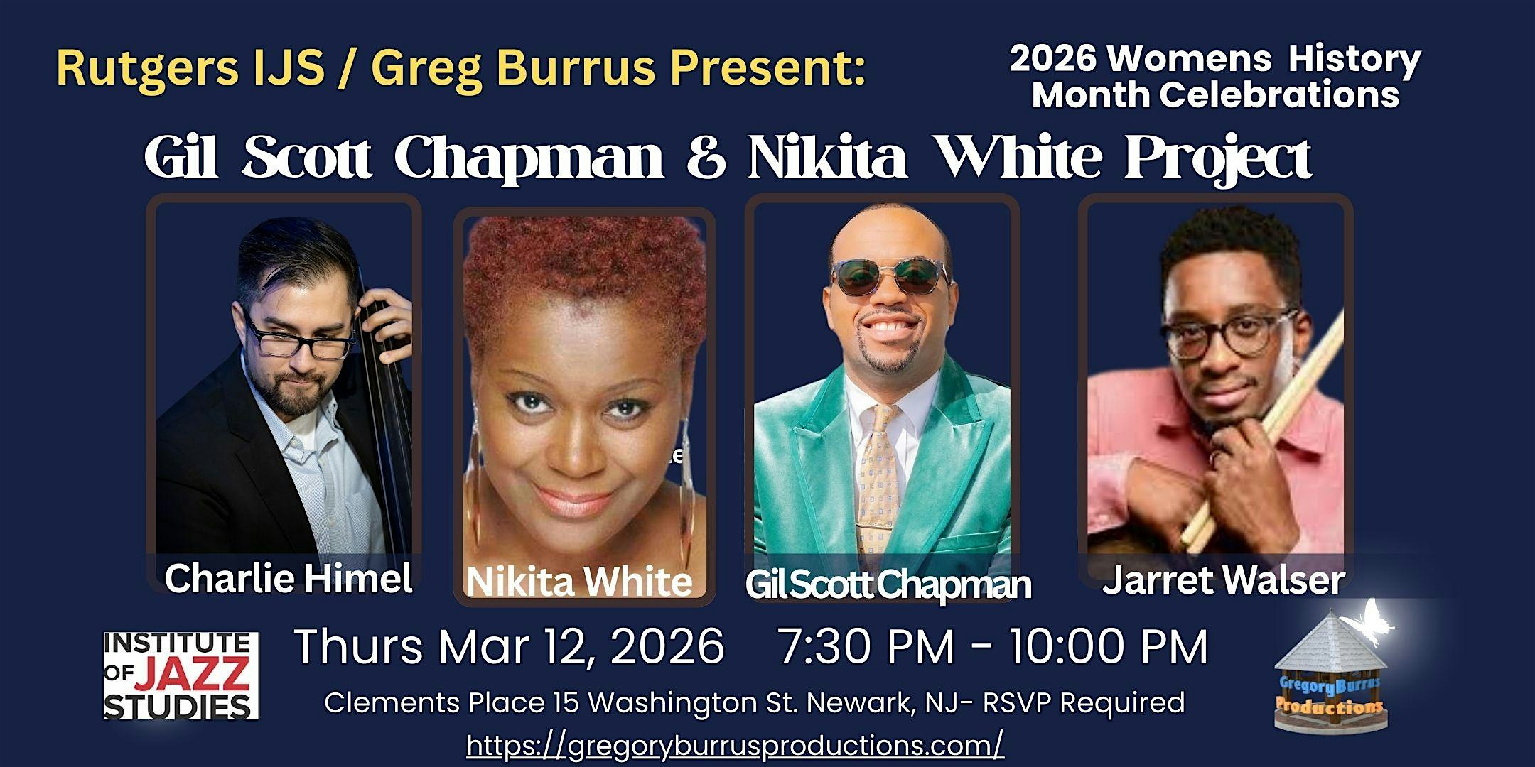 by admin13Feb Rutgers IJS & Greg Burrus Present Gil Scott Chapman / Nikita White Project at Clement’s Place – Newark, NJ Rutgers IJS & Greg Burrus Present Gil Scott Chapman / Nikita White Project at Clement’s Place – Newark, NJ 1 1 people viewed this event. Catch the vibes live with Gil Scott Chapman & Nikita White Project, brought to you by Rutgers IJS & Greg Burrus! Tickets-RSVP Link Date And Time Friday, March 20th, 2026 11:00 PM (PST) Venue Clement's Place Location 15 Washington Street, Newark, NJ 7102 Event Types Concert or PerformanceMusic Event Category New Jersey Share With Friends Facebook Twitter Linkedin Xing Pinterest Share This Post: