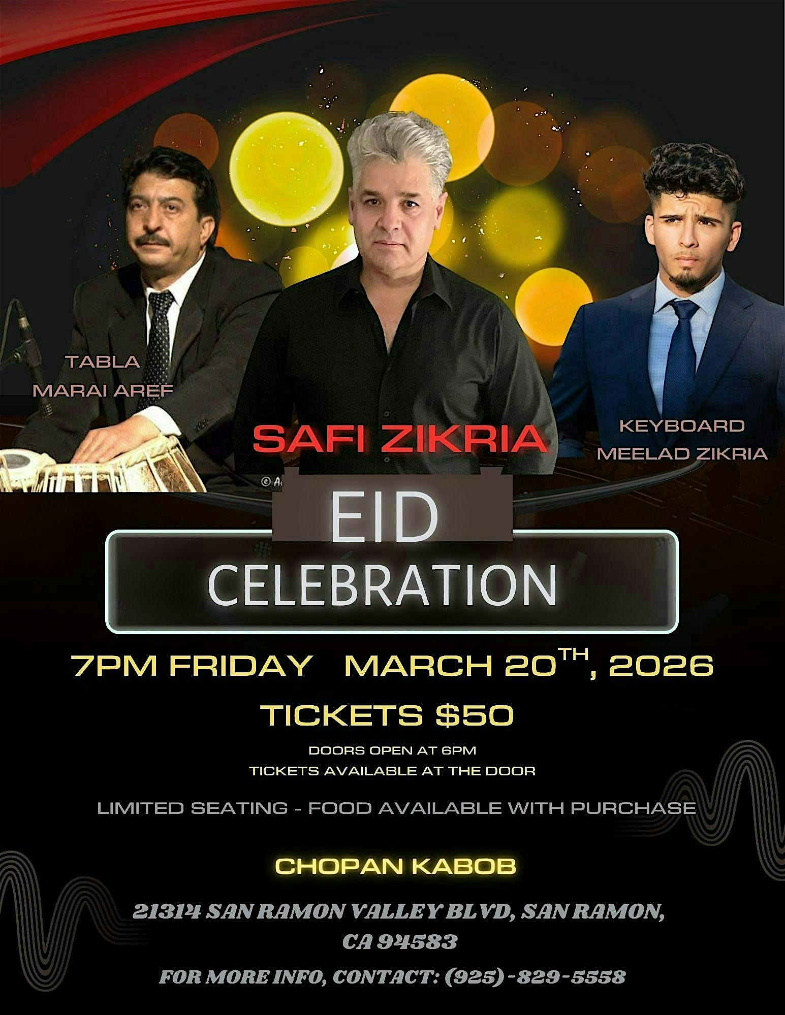 by admin24Feb Safi Zikria Live in Concert | Eid Celebration at Chopan kabob – San Ramon, CA Safi Zikria Live in Concert | Eid Celebration at Chopan kabob – San Ramon, CA 2 2 people viewed this event. Celebrate Eid with an unforgettable night of live music at the Safi Zikria. Book your tickets now and don’t miss this Eid highlight! Tickets-RSVP Link Date And Time Friday, March 20th, 2026 07:00 PM (PST) Venue Chopan kabob Location 21314 San Ramon Valley Boulevard, San Ramon, CA 94583 Event Types Concert or PerformanceMusic Event Category California Share With Friends Facebook Twitter Linkedin Xing Pinterest Share This Post: