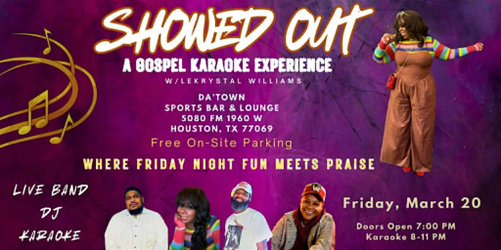 by admin23Feb SHOWED OUT: A Gospel Karaoke Experience at Da’ Town – Houston, TX SHOWED OUT: A Gospel Karaoke Experience at Da’ Town – Houston, TX 1 1 people viewed this event. Even if you “can’t sing” you belong here. Live band gospel karaoke, DJ, drinks & a packed room. Tickets-RSVP Link Date And Time Friday, March 20th, 2026 07:00 PM (PST) Venue Da' Town Location 5060 Farm to Market 1960 Road West, Houston, TX 77069 Event Types Food & DrinkParty or Social Gathering Event Category HoustonTexas Share With Friends Facebook Twitter Linkedin Xing Pinterest Share This Post: