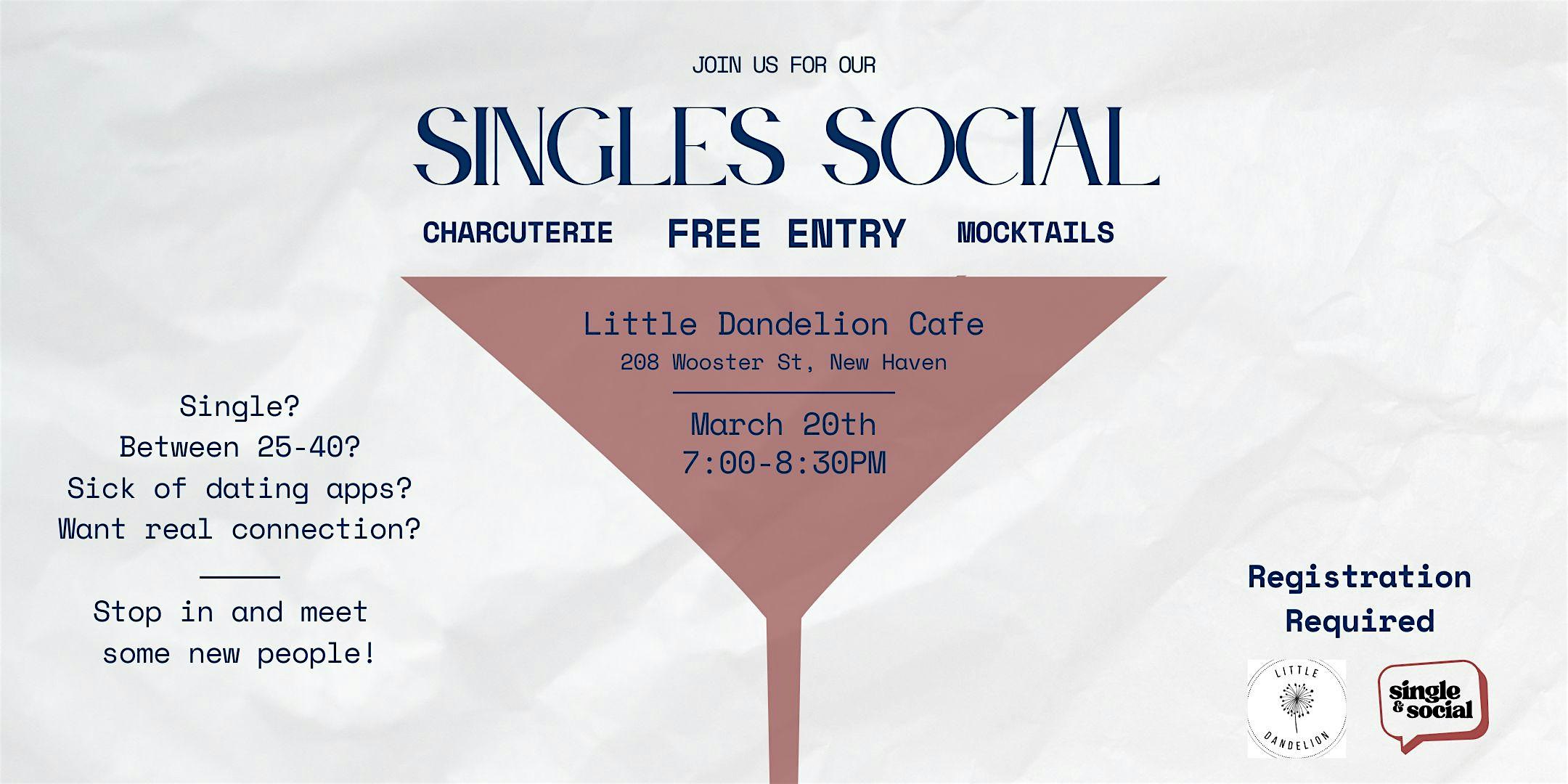 by admin27Feb Singles Social at Little Dandelion Cafe at Little Dandelion – New Haven, CT Singles Social at Little Dandelion Cafe at Little Dandelion – New Haven, CT 1 1 people viewed this event. Meet new people and mingle over coffee at Little Dandelion Cafe’s fun Singles Social event! Tickets-RSVP Link Date And Time Friday, March 20th, 2026 @ 07:00 PM Location 208 Wooster Street, New Haven, CT 6511 Event Types Community & CultureParty or Social Gathering Event Category Connecticut Share With Friends Facebook Twitter Linkedin Xing Pinterest Share This Post:
